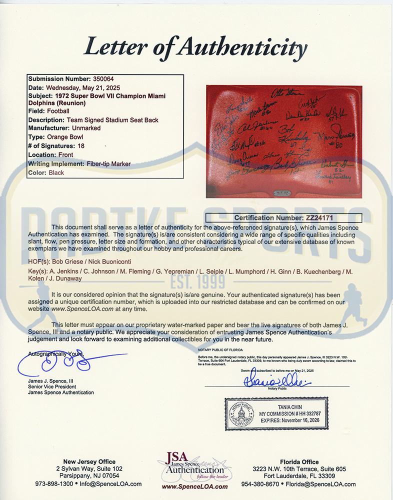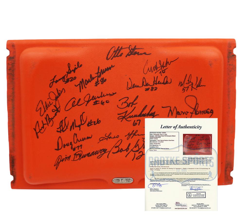 Orange Bowl Stadium Seatback has been hand-signed by (18) members of the 1972 Miami Dolphins! Signers include Bob Griese, Nick Buoniconti, Al Jenkins, Curtis Johnson, Marv Fleming, Garo Yepremian, Larry Seiple, Lloyd Mumphord, Hubert Ginn, Bob Kuechenberg, Mike Kolen, and Jim Dunaway.