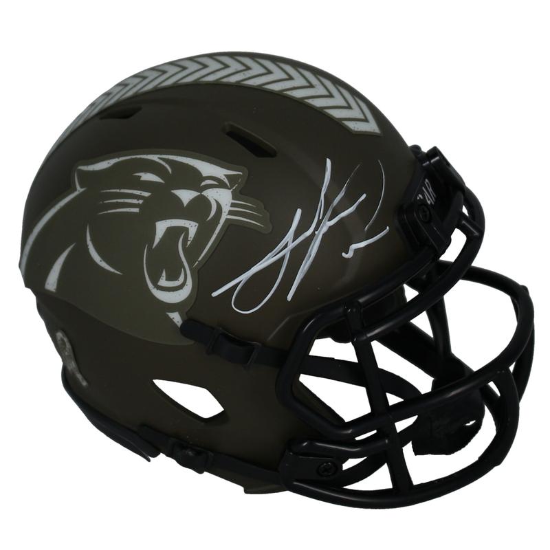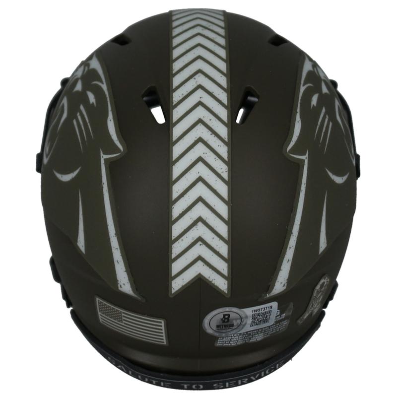 Riddell Carolina Panthers salute to service alternate speed mini helmet. Hand-signed by Julius Peppers.