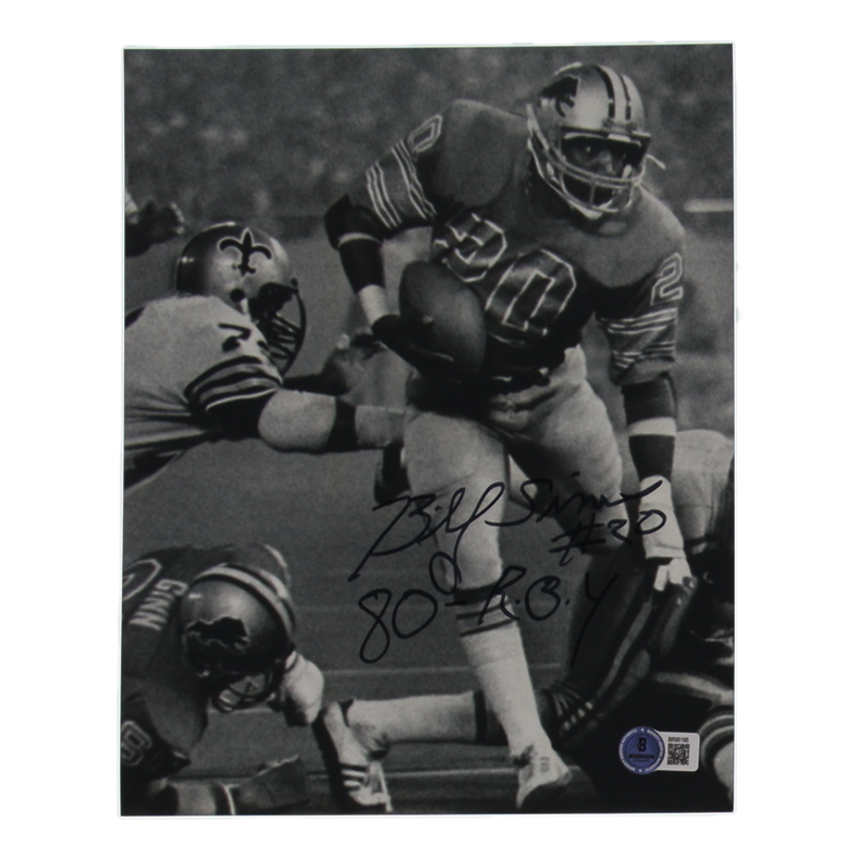 Photo measures 8" x 10" in size. Hand-signed and inscribed by Billy Sims (Detroit Lions).