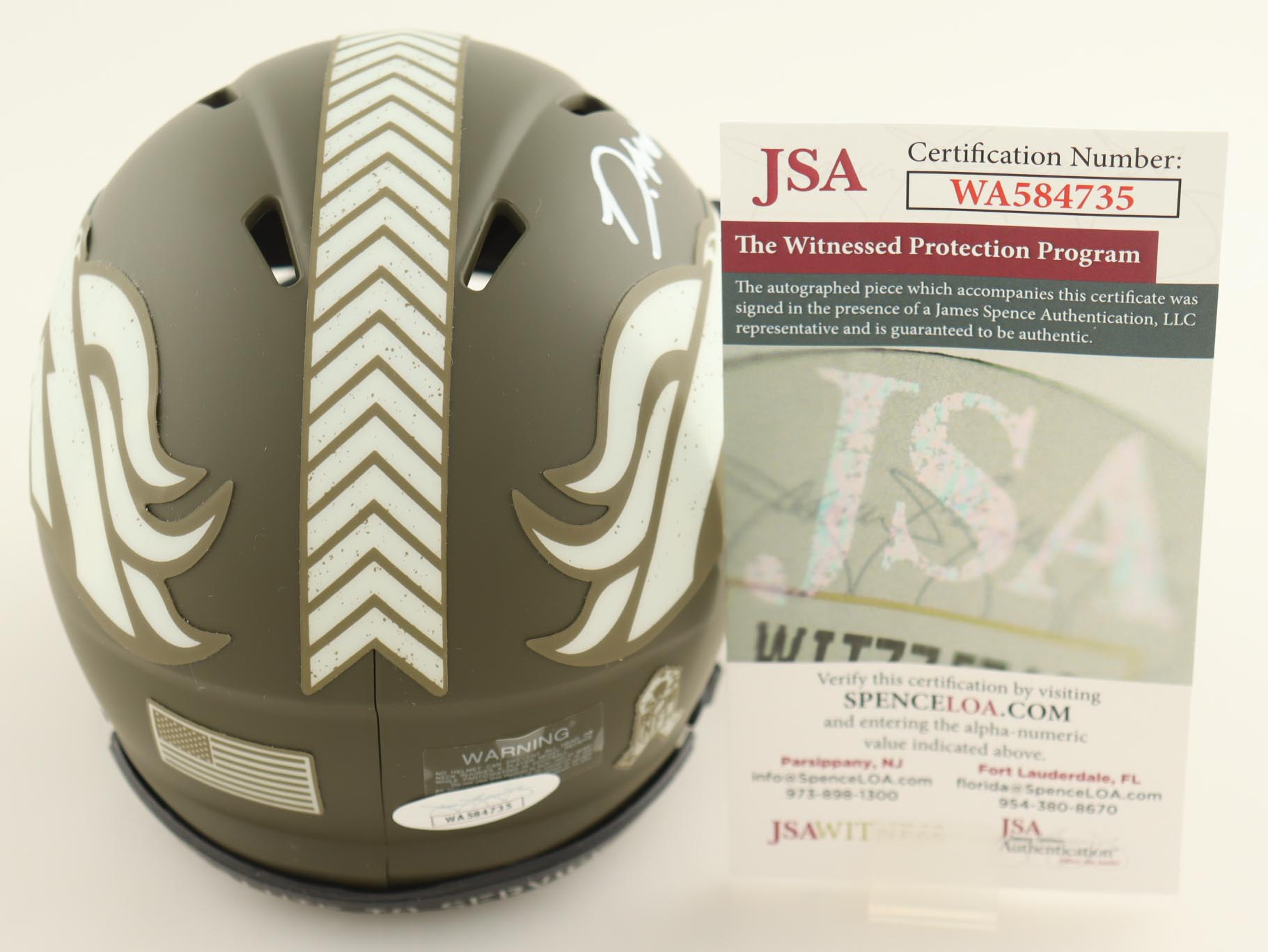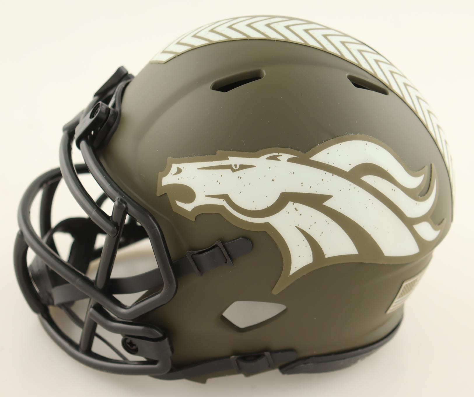 Riddell Denver Broncos Salute To Service Alternate speed mini helmet. Hand-signed by Damarri Mathis.