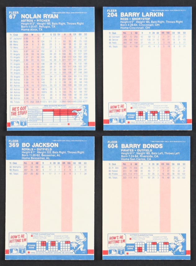 1987 Fleer Baseball Complete Set of (660) Cards with Barry Bonds #604 RC, Bo Jackson #369 RC, Barry Larkin #204 RC, Nolan Ryan #67