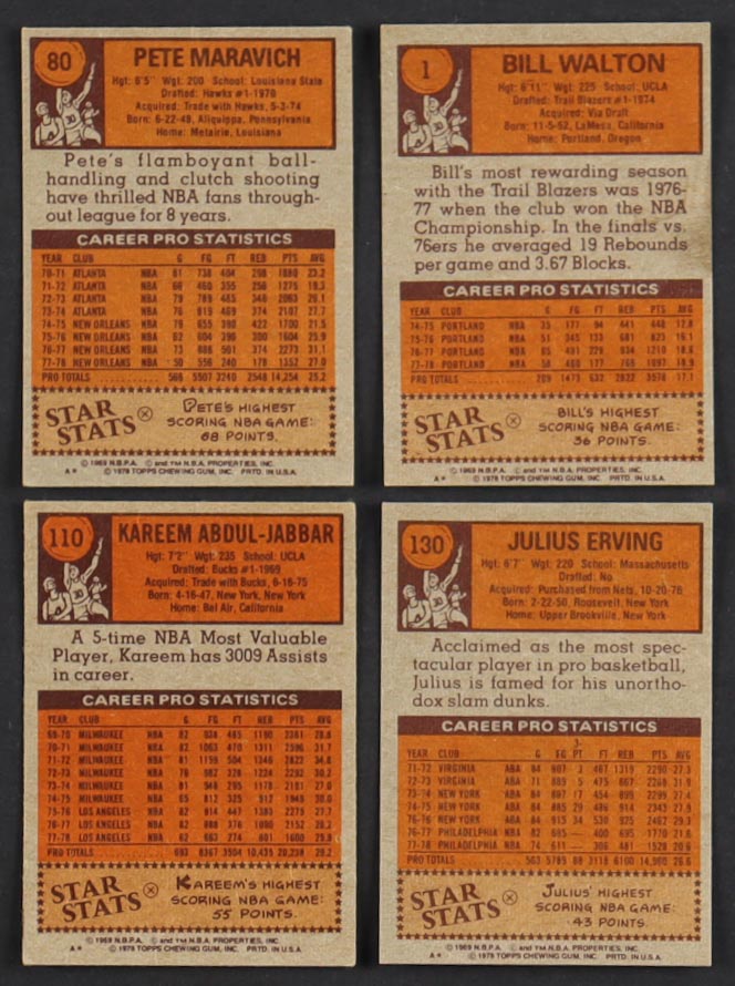 1978-79 Topps Basketball Cards Complete Set Of (132) With Julius Erving #130, Pete Maravich #80, Kareem Abdul-Jabbar #110, Bill Walton #1