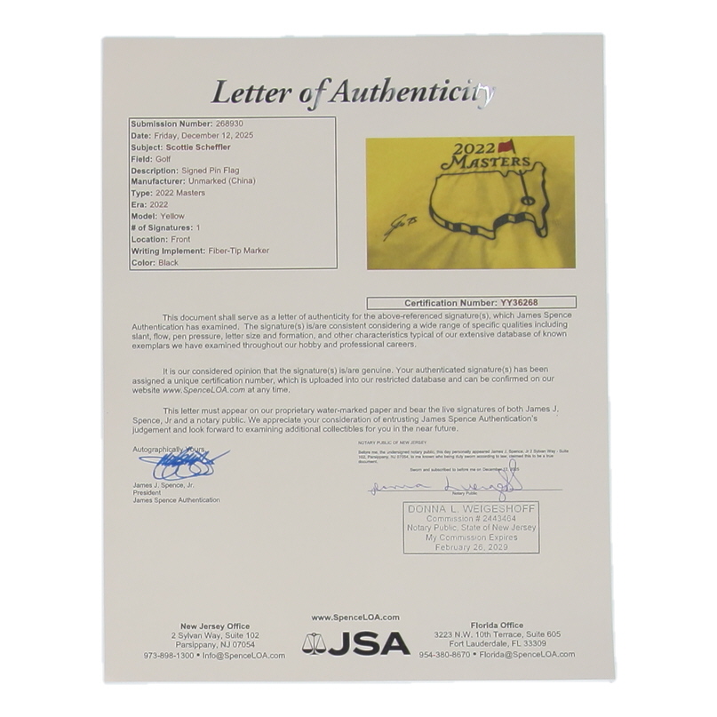 Scottie Scheffler Signed 2022 Masters Tournament Pin Flag (JSA)