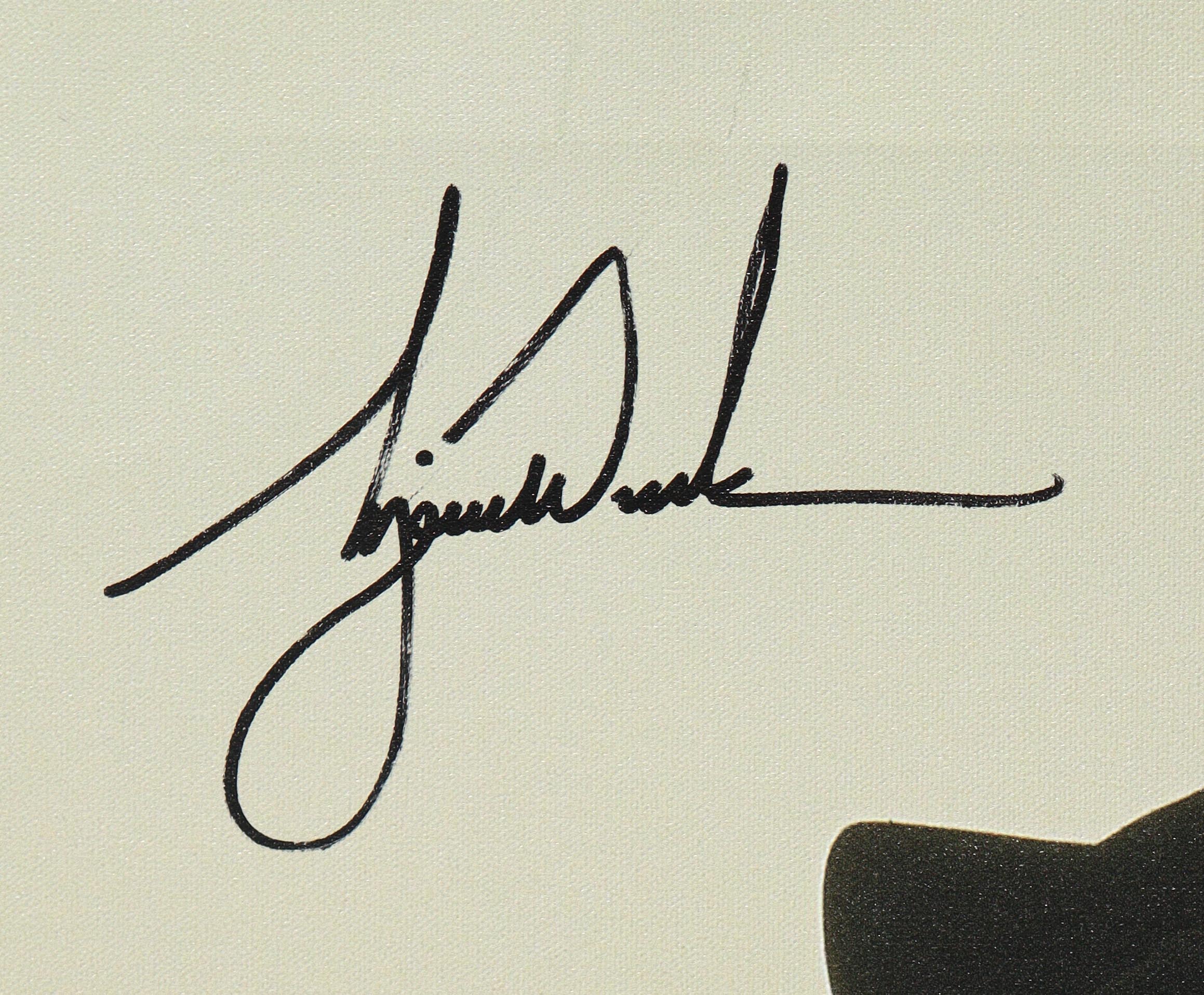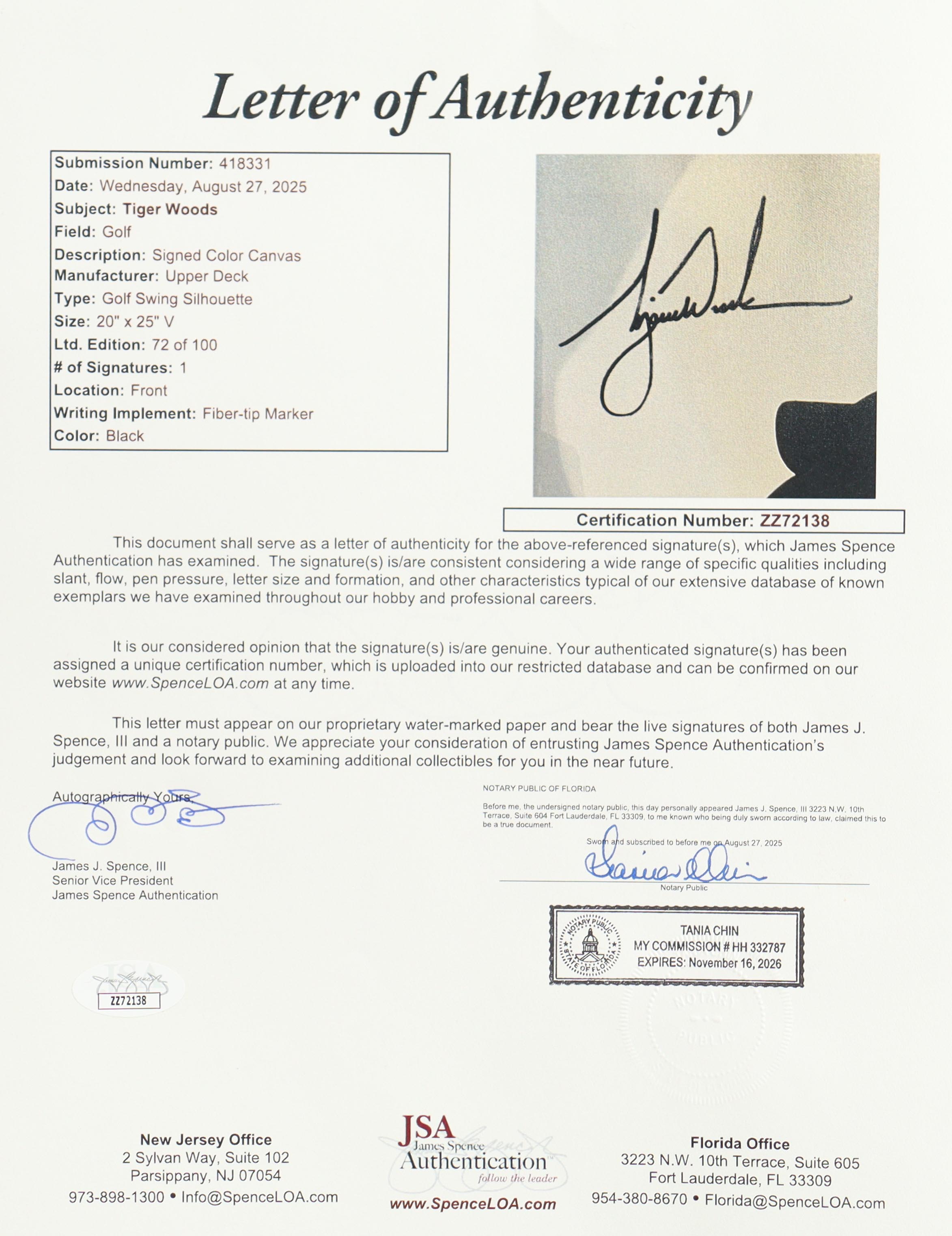 Custom frame measures 25.5" x 30.5" in size and features a canvas that has been hand-signed by Tiger Woods! This piece is limited edition and has been hand-numbered #72/100!