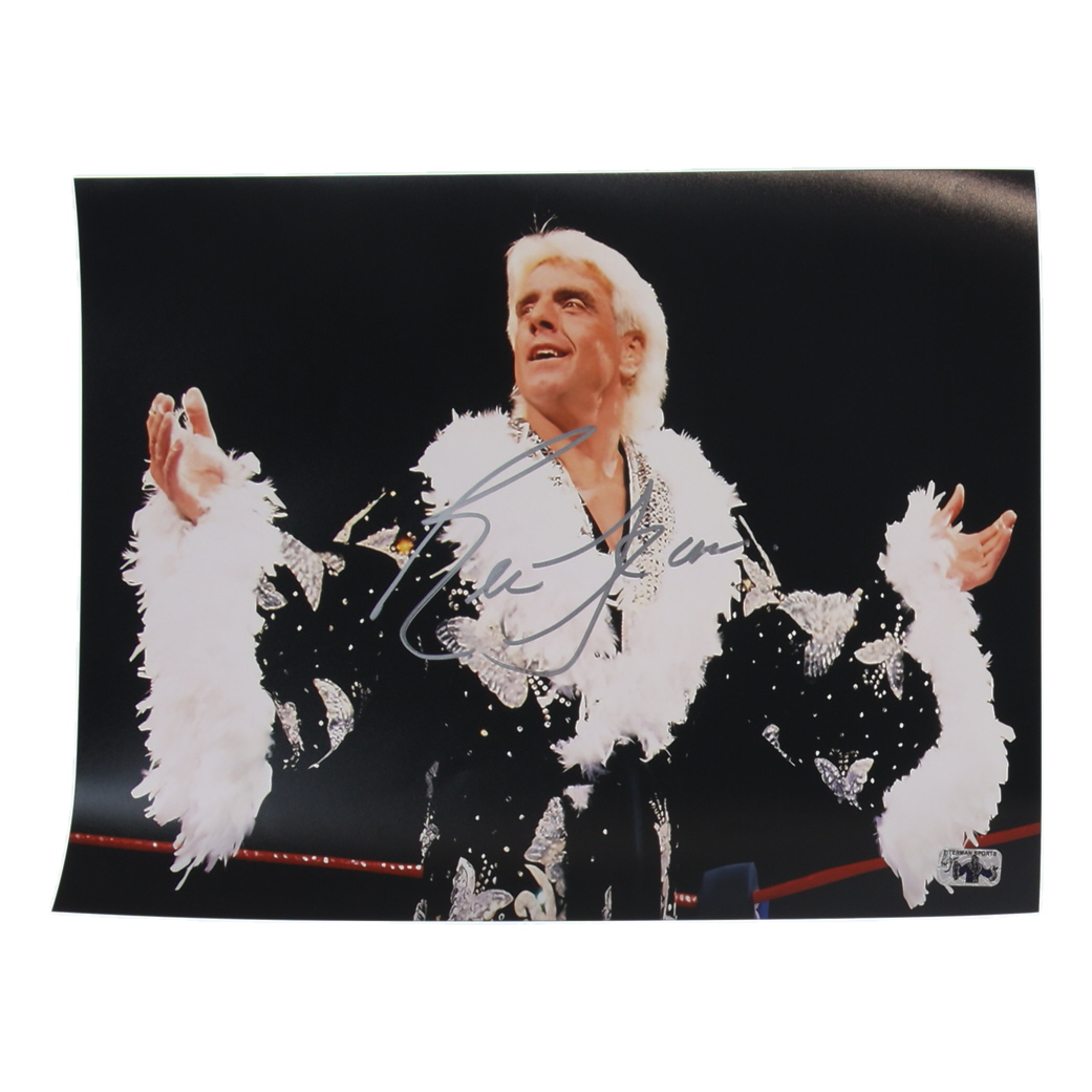 Photo measures 11" x 14" in size and has been hand-signed by Ric Flair (HOF).
