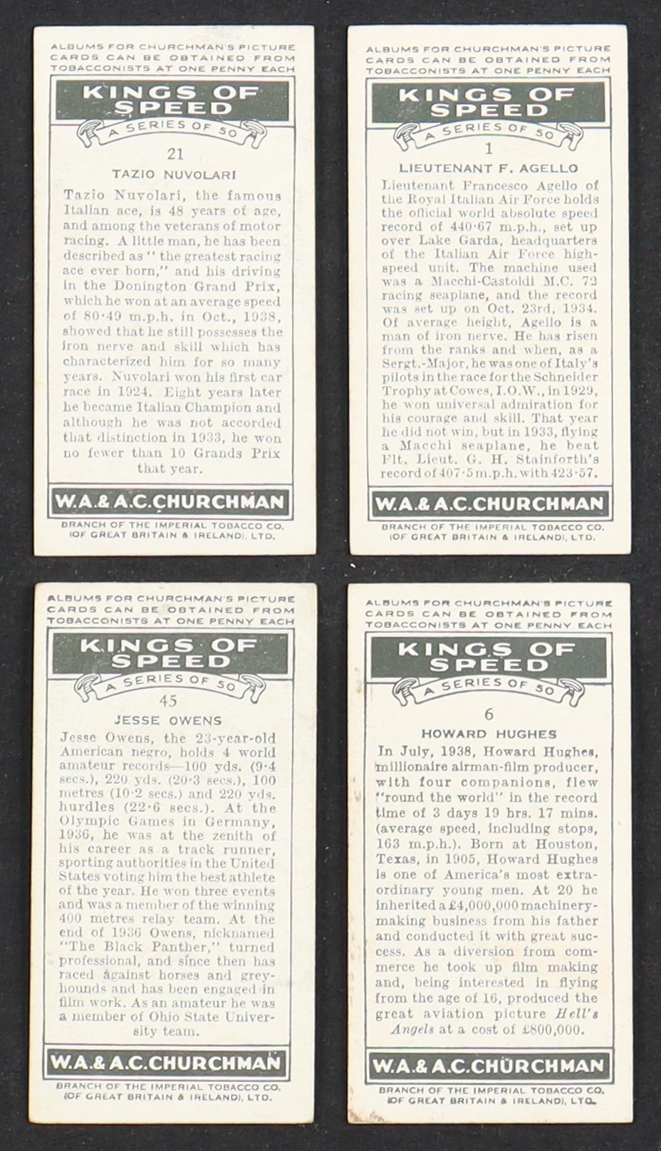 1939 Churchman Kings of Speed Complete Set of (50) Cigarette Cards with Jesse Owens #45 and Howard Hughes #6