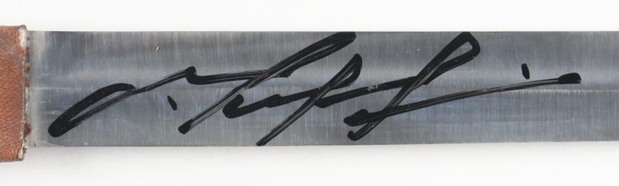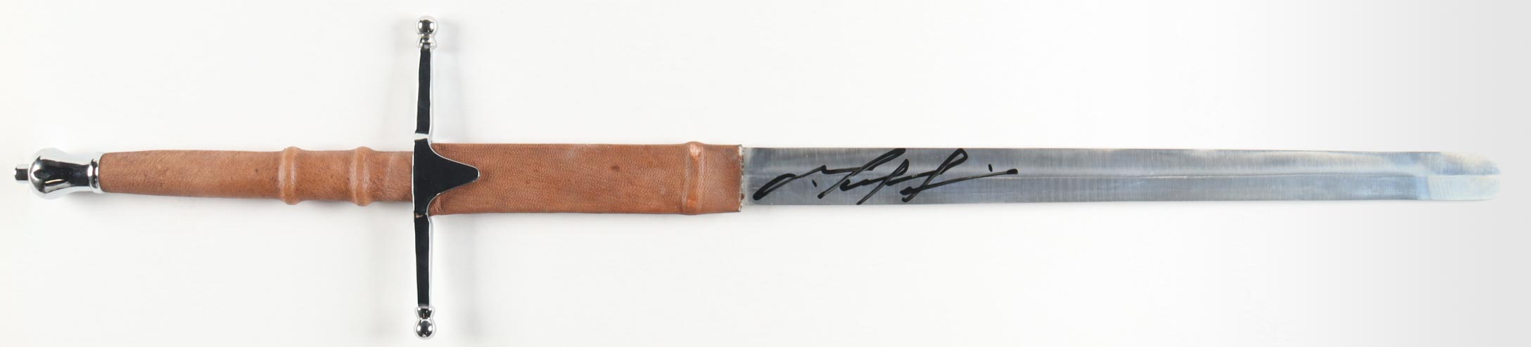 Replica sword measures approximately 40.75" in length and has been hand-signed on the blade by Mel Gibson (William Wallace)