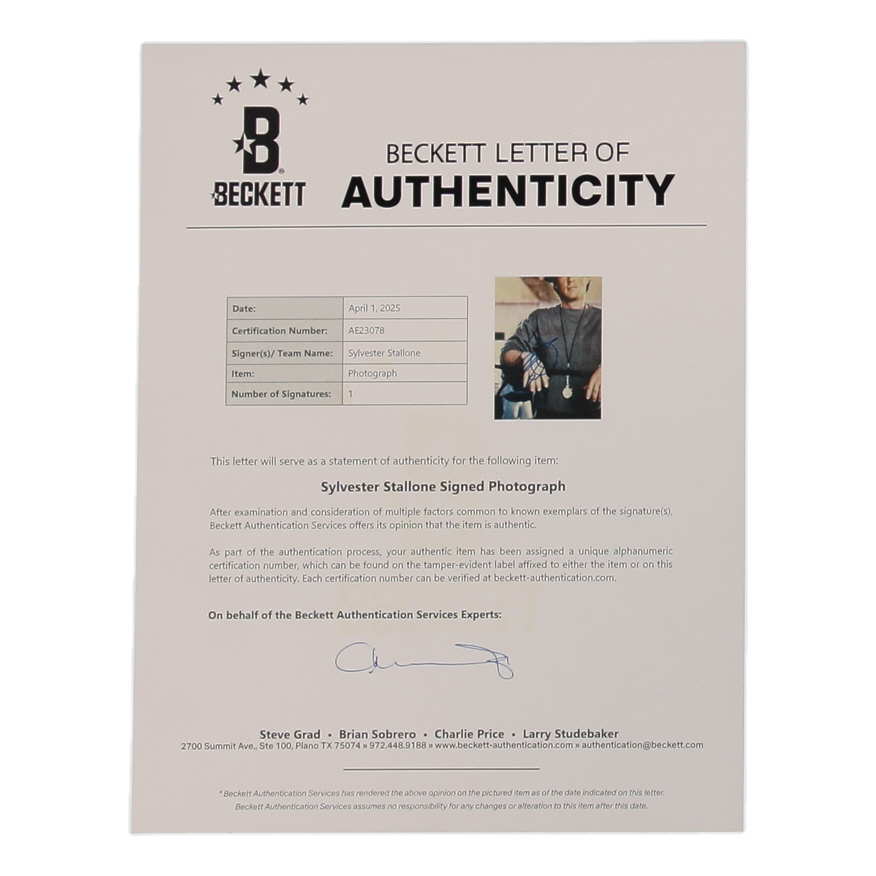 Photo measures 8" x 10" in size and has been hand-signed by Sylvester Stallone.