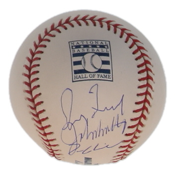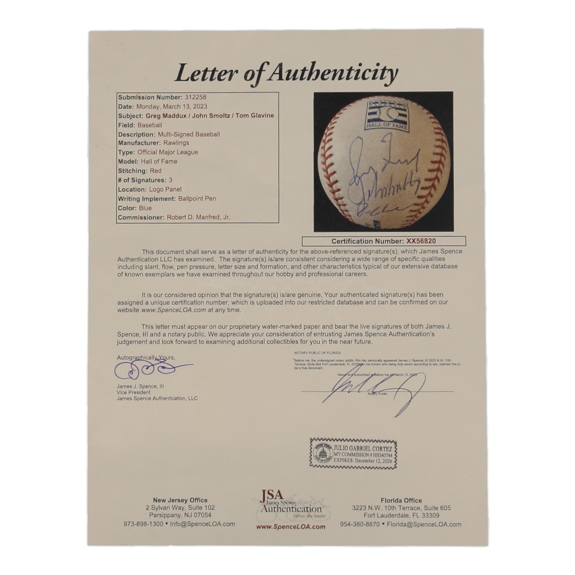 Rawlings Official Major League Hall of Fame logo baseball. Hand-signed by Greg Maddux, Tom Glavine, and John Smoltz (Atlanta Braves, HOF).