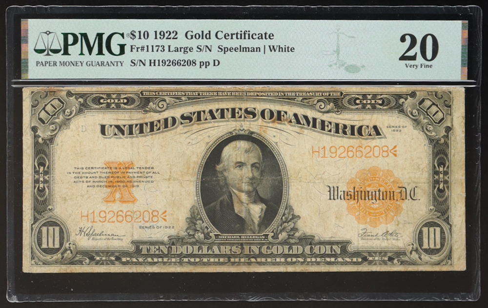 1922 $10 Ten Dollars Gold Certificate (PMG Very Fine 20)