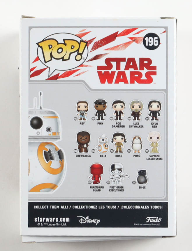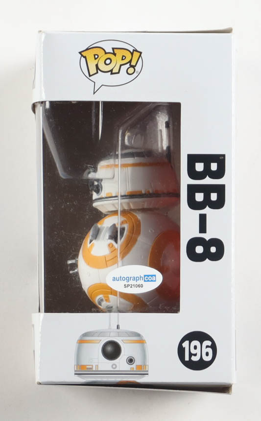 Funko Pop! bobble-head vinyl figure measures approximately 4" in height. Hand-signed on the packaging by J.J. Abrams (Director). Please note, the window has been swapped, and the signature is scuffed.