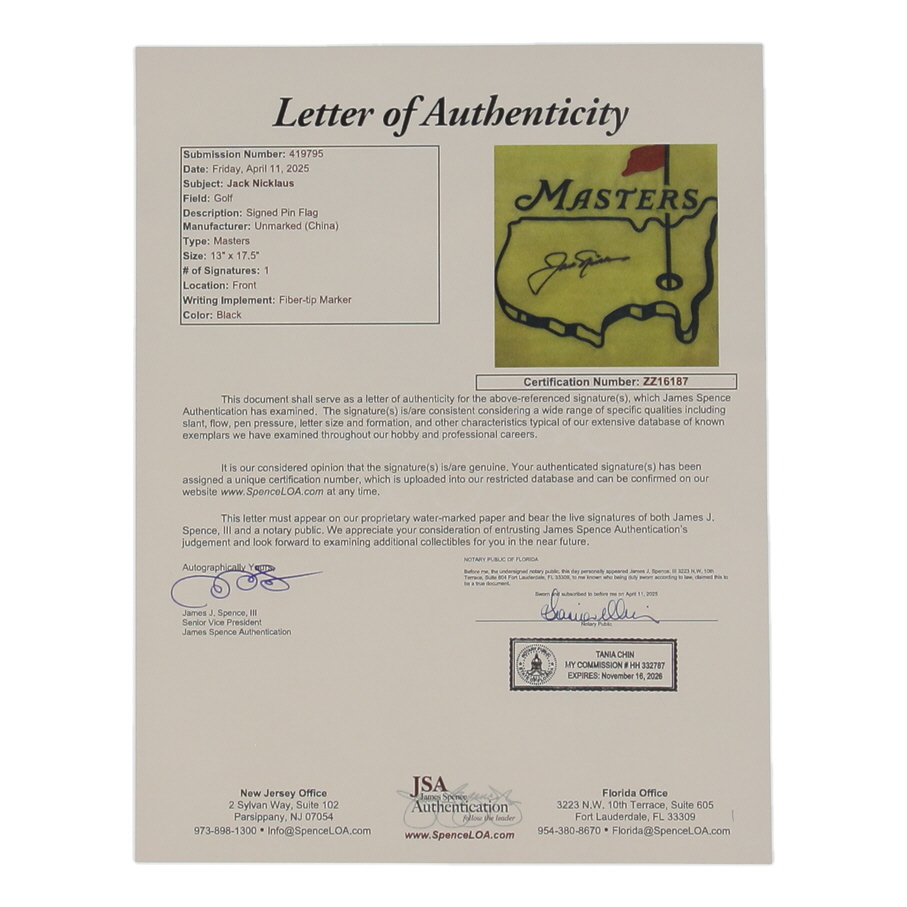 Pin flag measures approximately 13" x 17" in size and has been hand-signed by Jack Nicklaus (HOF).