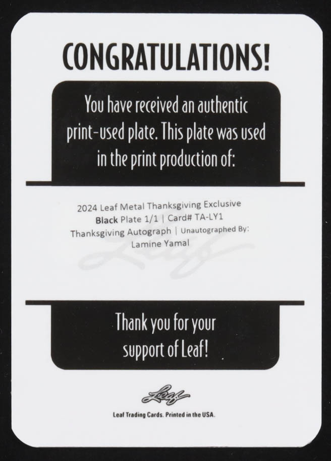 Lamine Yamal 2024 Leaf Metal Thanksgiving Exclusive Printing Plates Black #TALY1 #1/1