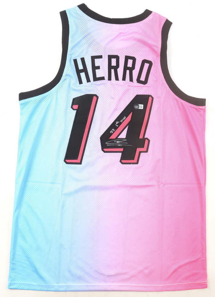Custom jersey with everything sewn on, size XL. Hand-signed and inscribed by Tyler Herro.