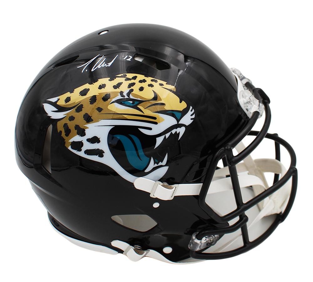 Riddell Jacksonville Jaguars full-size authentic on-field speed helmet has been hand-signed by Travis Hunter.