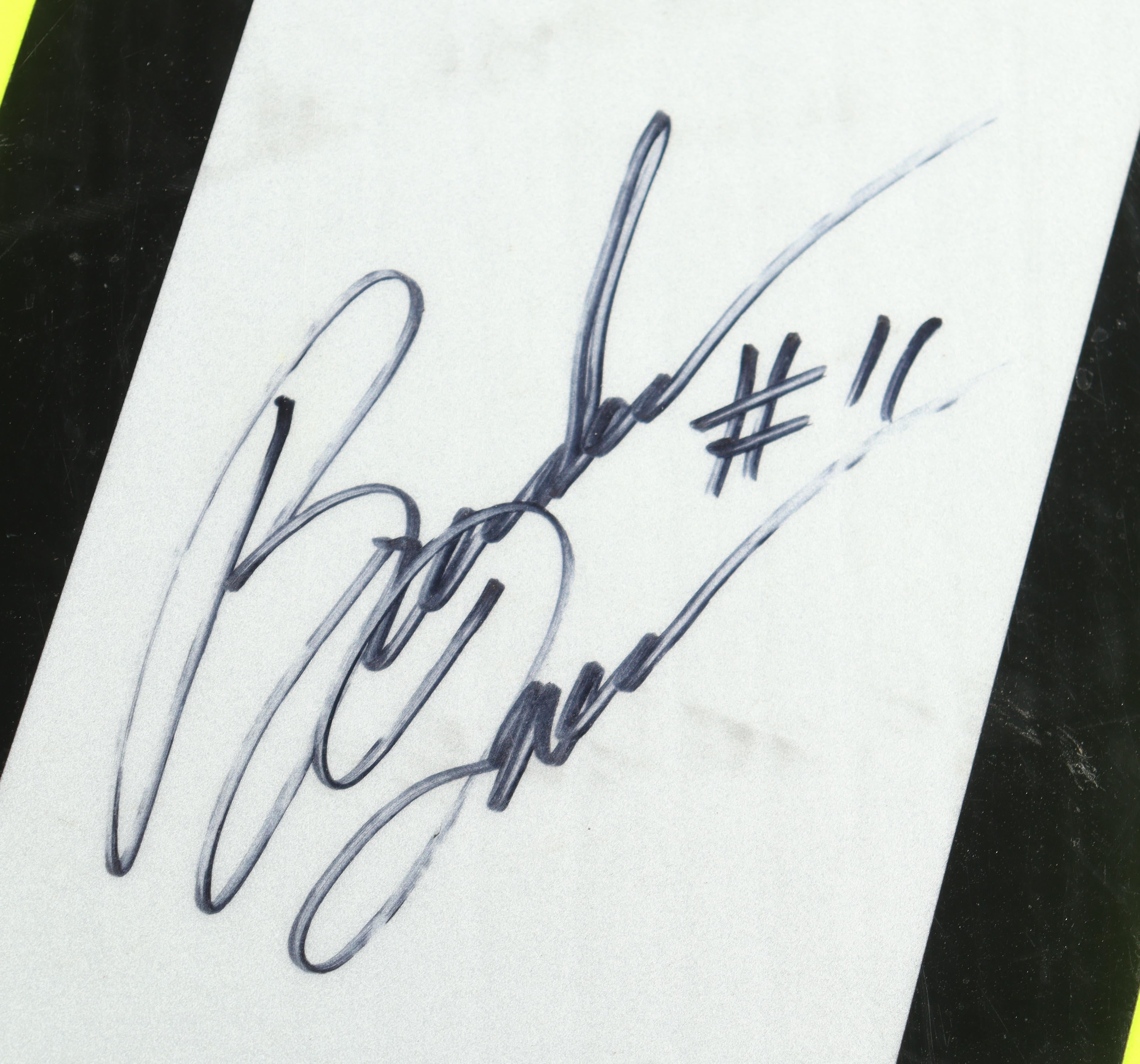 "11" Race-Used Pit Board measures approximately 24" x 36" in size and has been hand-signed and inscribed by Brenden Queen. Please note, board shows signs of wear.