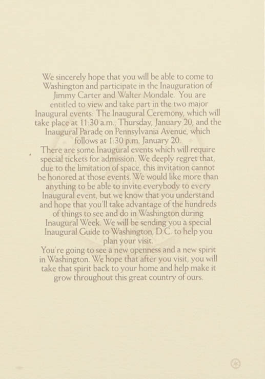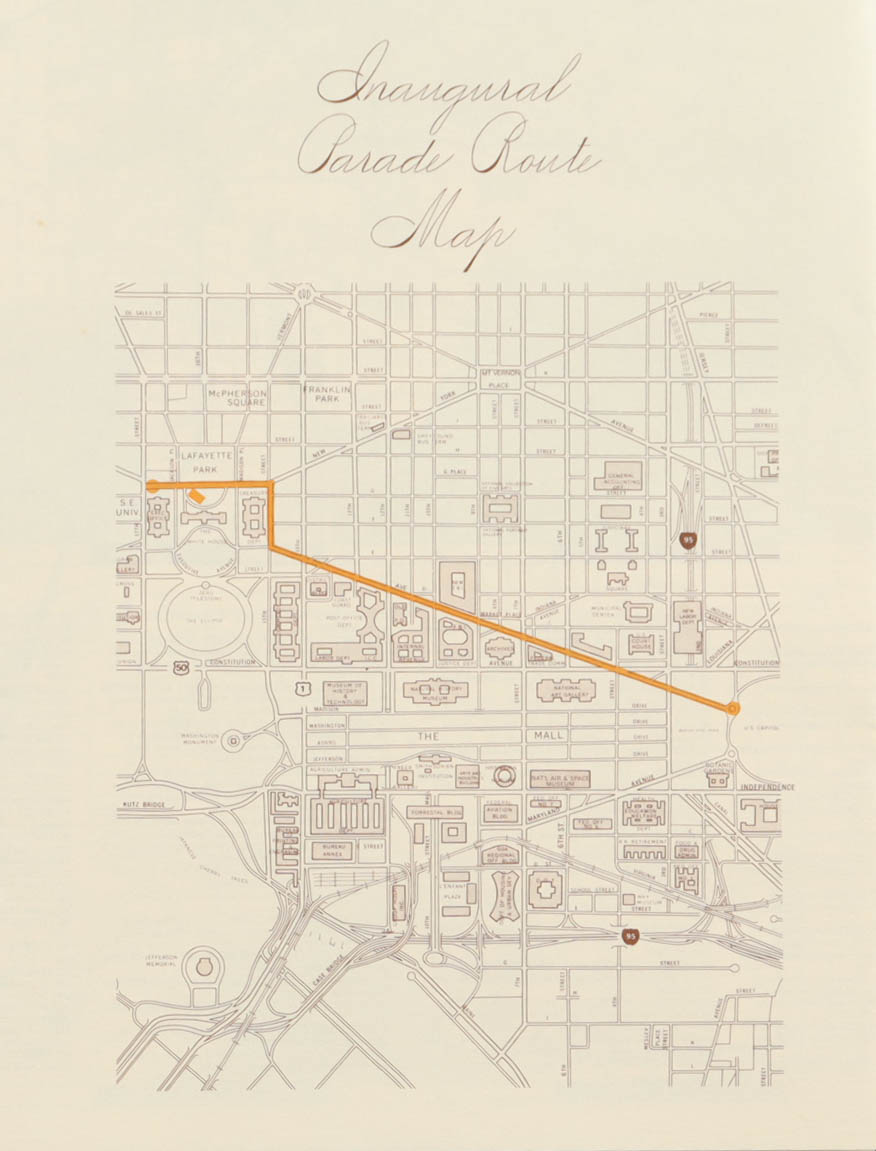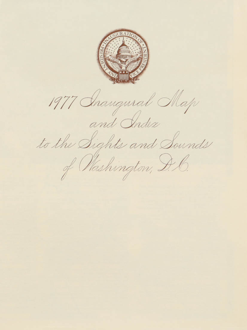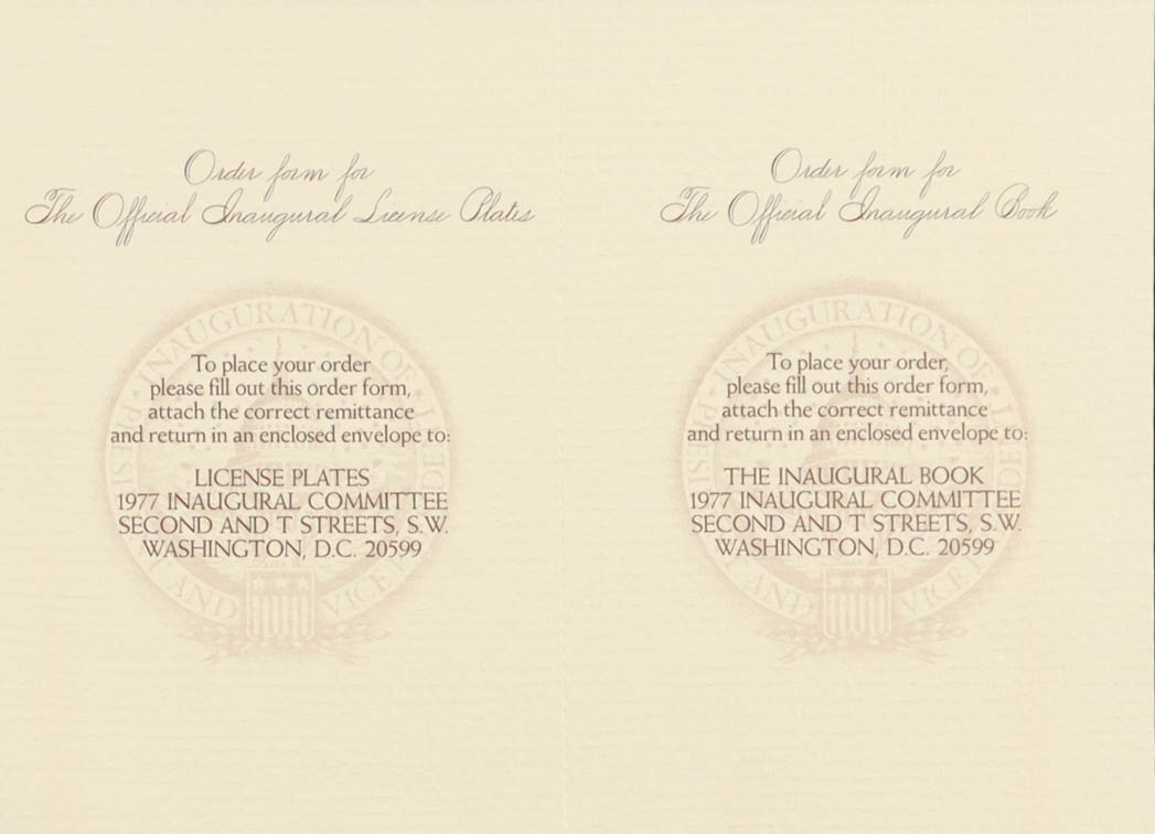 Set includes (1) Jimmy Carter engraved pin, (1) sealed document set, (1) invitation letter, (1) order form insert, (1) Washington, D.C. map and index, and (1) program booklet.