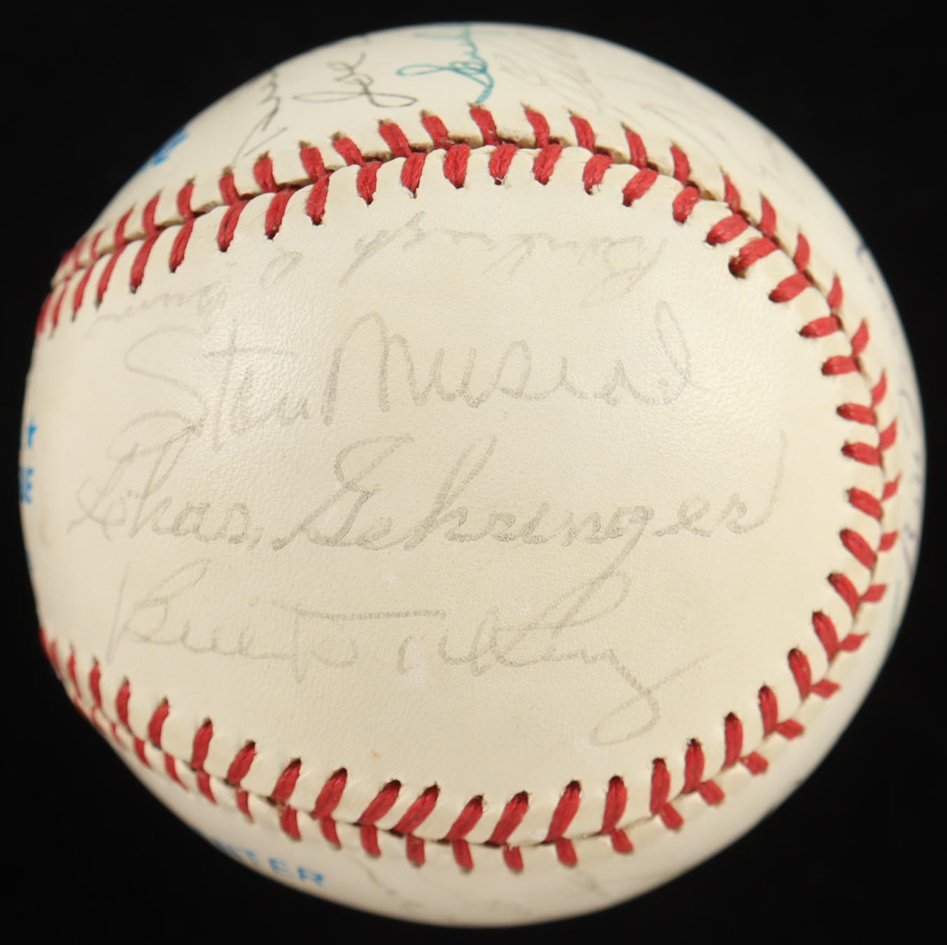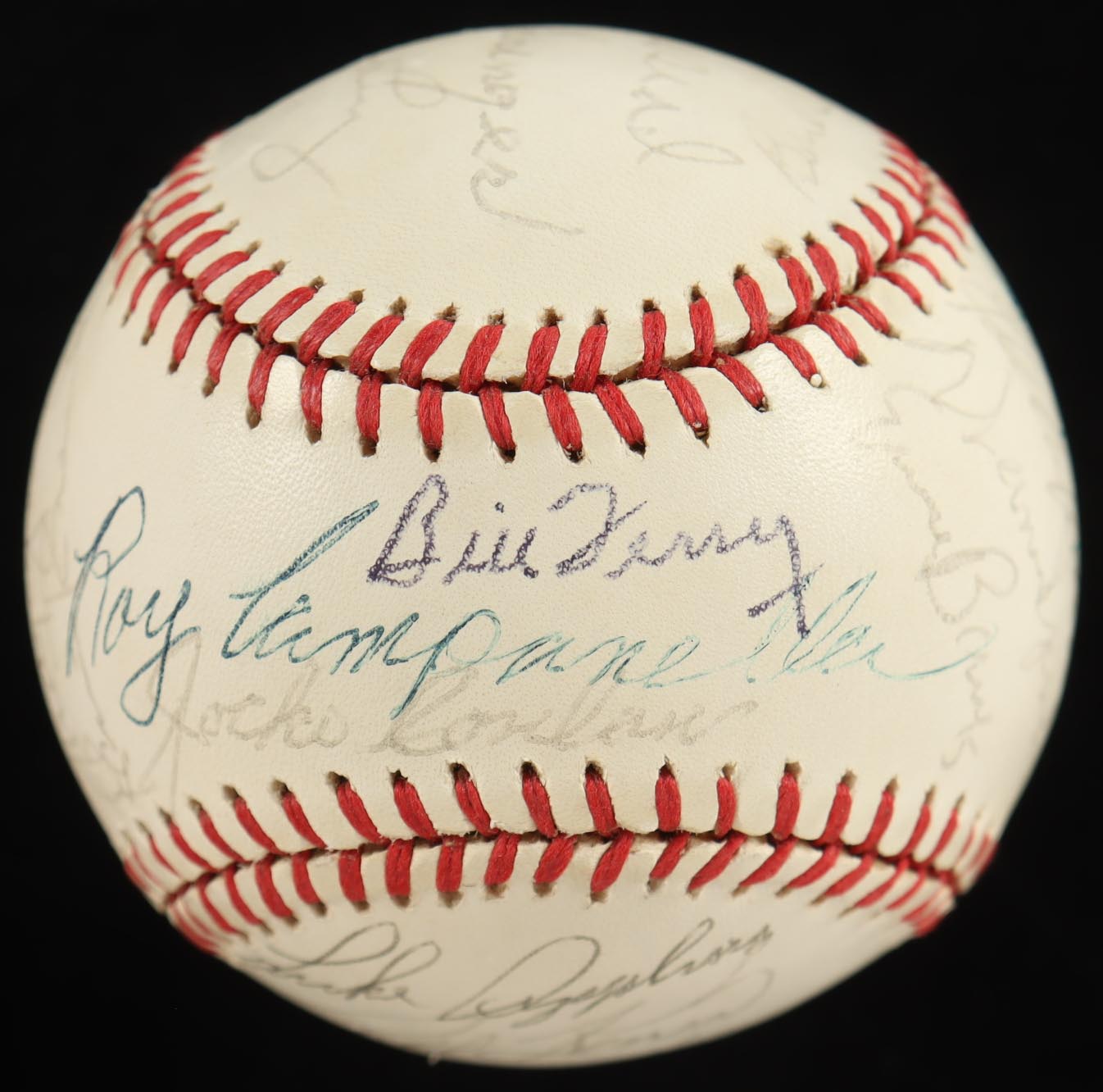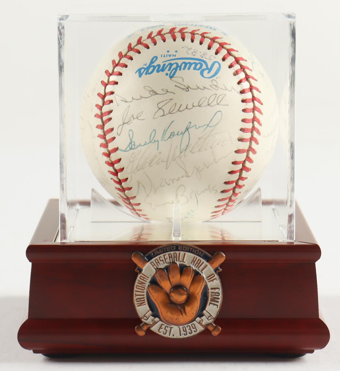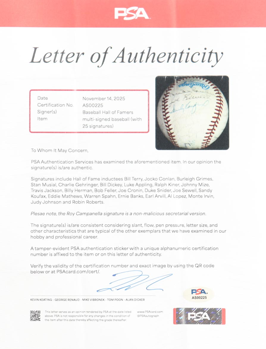 Rawlings Official American League baseball has been hand-signed by Bill Terry, Jocko Conlan, Burleigh Grimes, Stan Musial, Charlie Gehringer, Bill Dickey, Luke Appling, Ralph Kiner, Johnny Mize, Travis Jackson, Billy Herman, Bob Feller, Joe Cronin, Duke Snider, Joe Sewell, Sandy Koufax, Eddie Mathews, Warren Spahn, Ernie Banks, Earl Arvill, Al Lopez, Monte Irvin, Judy Johnson and Robin Roberts (HOF). Includes display case as shown. Please note, the Roy Campanella signature is a non-malicious secretarial baseball version and the ball is naturally toned.