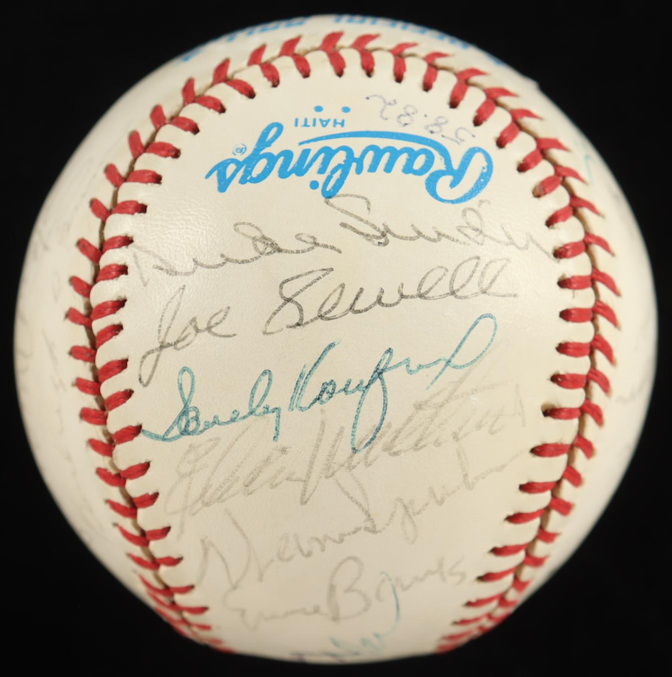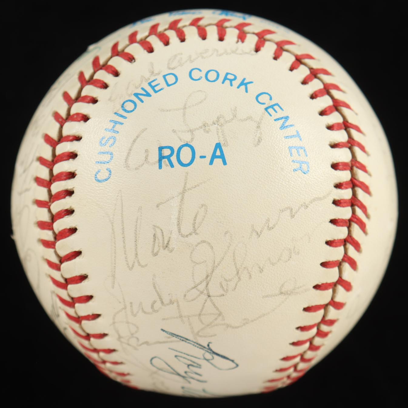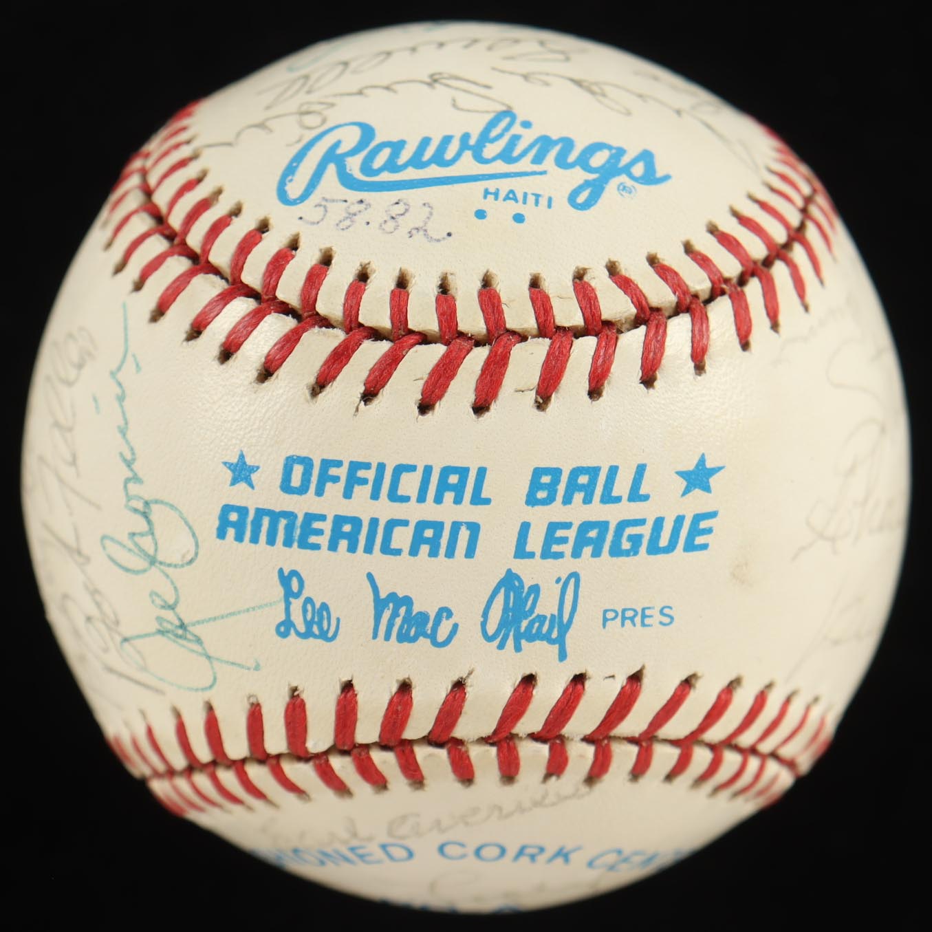 Rawlings Official American League baseball has been hand-signed by Bill Terry, Jocko Conlan, Burleigh Grimes, Stan Musial, Charlie Gehringer, Bill Dickey, Luke Appling, Ralph Kiner, Johnny Mize, Travis Jackson, Billy Herman, Bob Feller, Joe Cronin, Duke Snider, Joe Sewell, Sandy Koufax, Eddie Mathews, Warren Spahn, Ernie Banks, Earl Arvill, Al Lopez, Monte Irvin, Judy Johnson and Robin Roberts (HOF). Includes display case as shown. Please note, the Roy Campanella signature is a non-malicious secretarial baseball version and the ball is naturally toned.