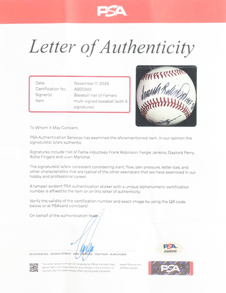 Rawlings Official Major League baseball has been hand-signed by (5) with Frank Robinson, Fergie Jenkins, Gaylord Perry, Rollie Fingers and Juan Marichal (HOF).