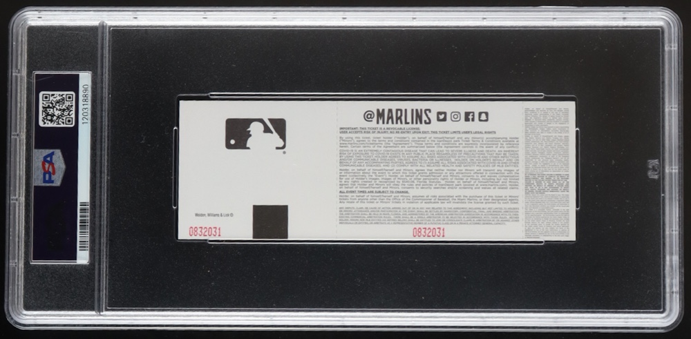 The ticket has been authenticated and encapsulated by PSA for authenticity purposes. The ticket has been graded 10 (GEM MT) by PSA.