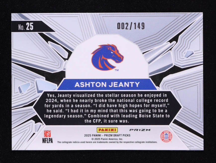 Ashton Jeanty 2025 Panini Prizm Draft Picks Prizm Break Blue Ice #25 #002/149 RC