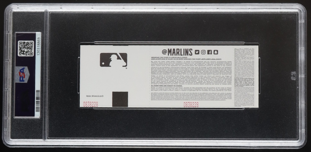 The ticket has been authenticated and encapsulated by PSA for authenticity purposes. The ticket has been graded 10 (GEM MT) by PSA.