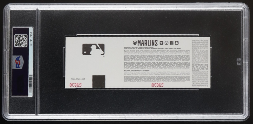 The ticket has been authenticated and encapsulated by PSA for authenticity purposes. The ticket has been graded 10 (GEM MT) by PSA.