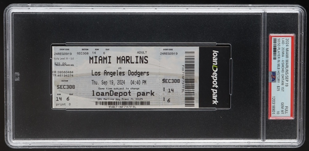 Original September 19th, 2024 Los Angeles Dodgers game ticket featuring Shohei Ohtani's 50/50 Milestone! This game was held at LoanDepot Park where the Dodgers took on the Marlins.