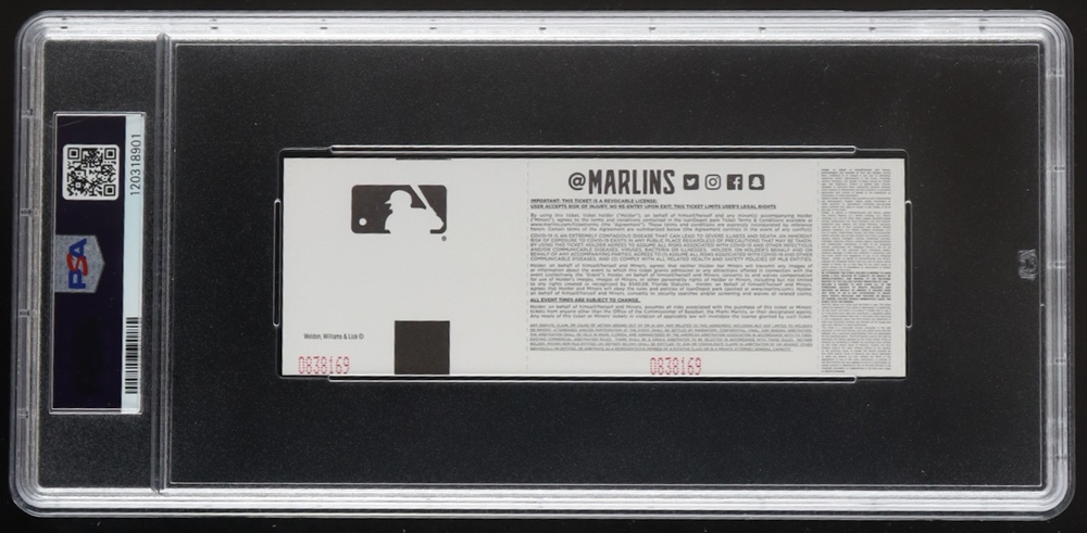 The ticket has been authenticated and encapsulated by PSA for authenticity purposes. The ticket has been graded 10 (GEM MT) by PSA.