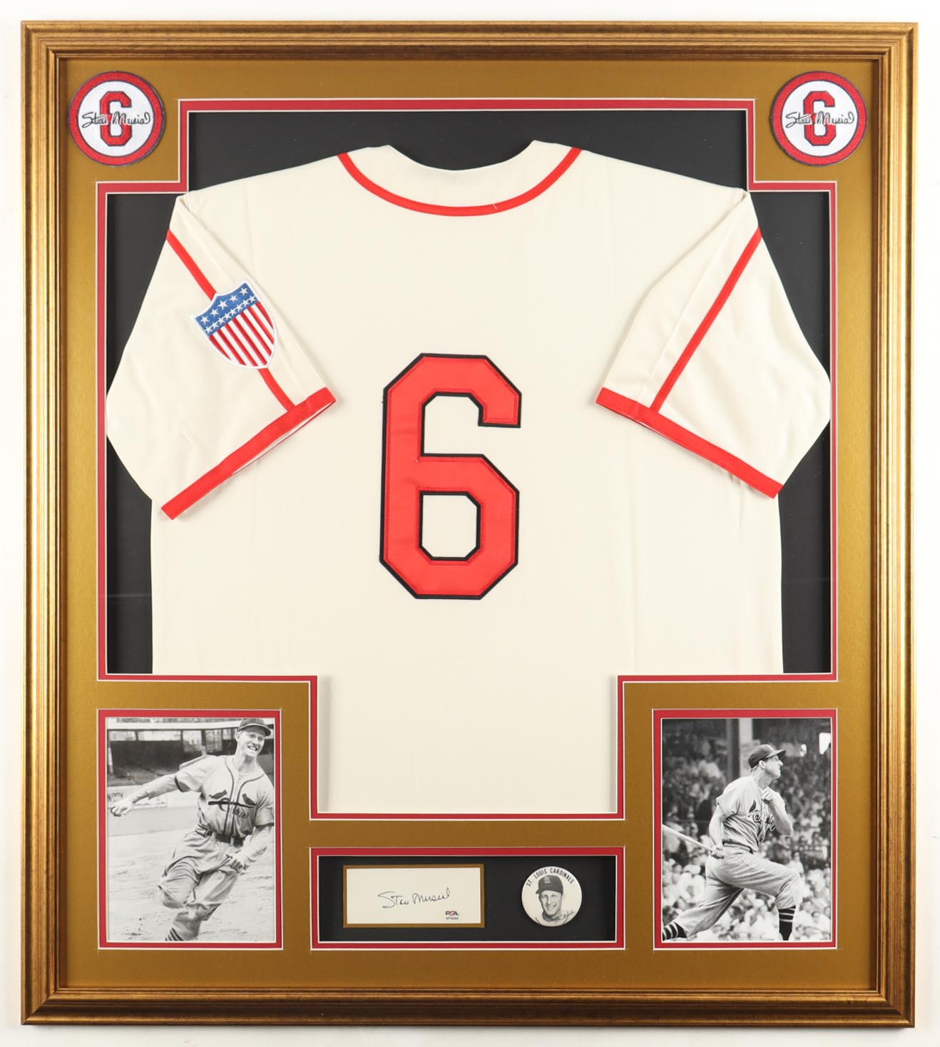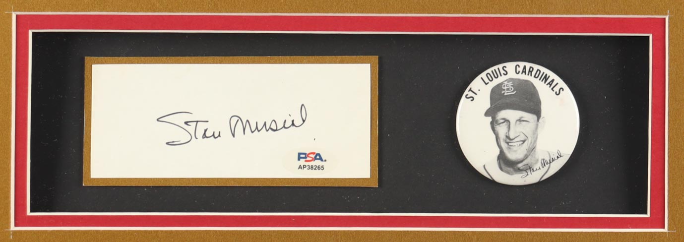Stan Musial Signed Custom Framed Cut Display with Jersey & Stan Musial Lapel Pin (PSA)