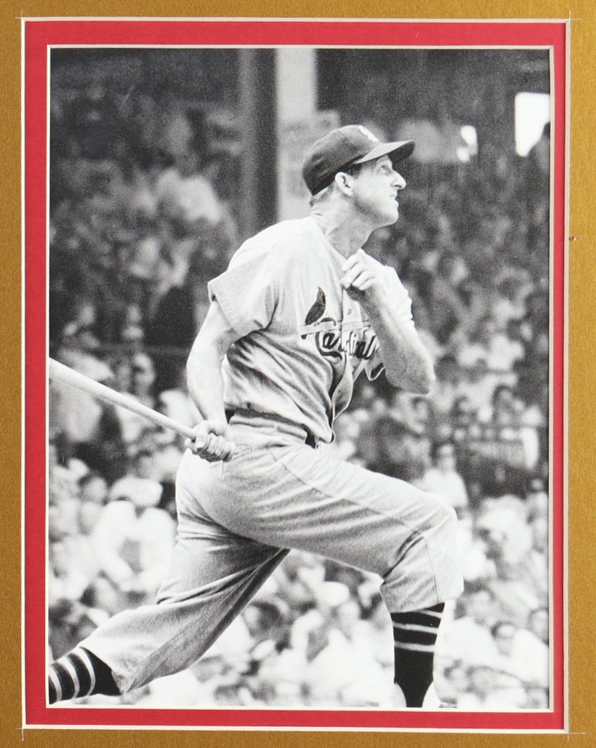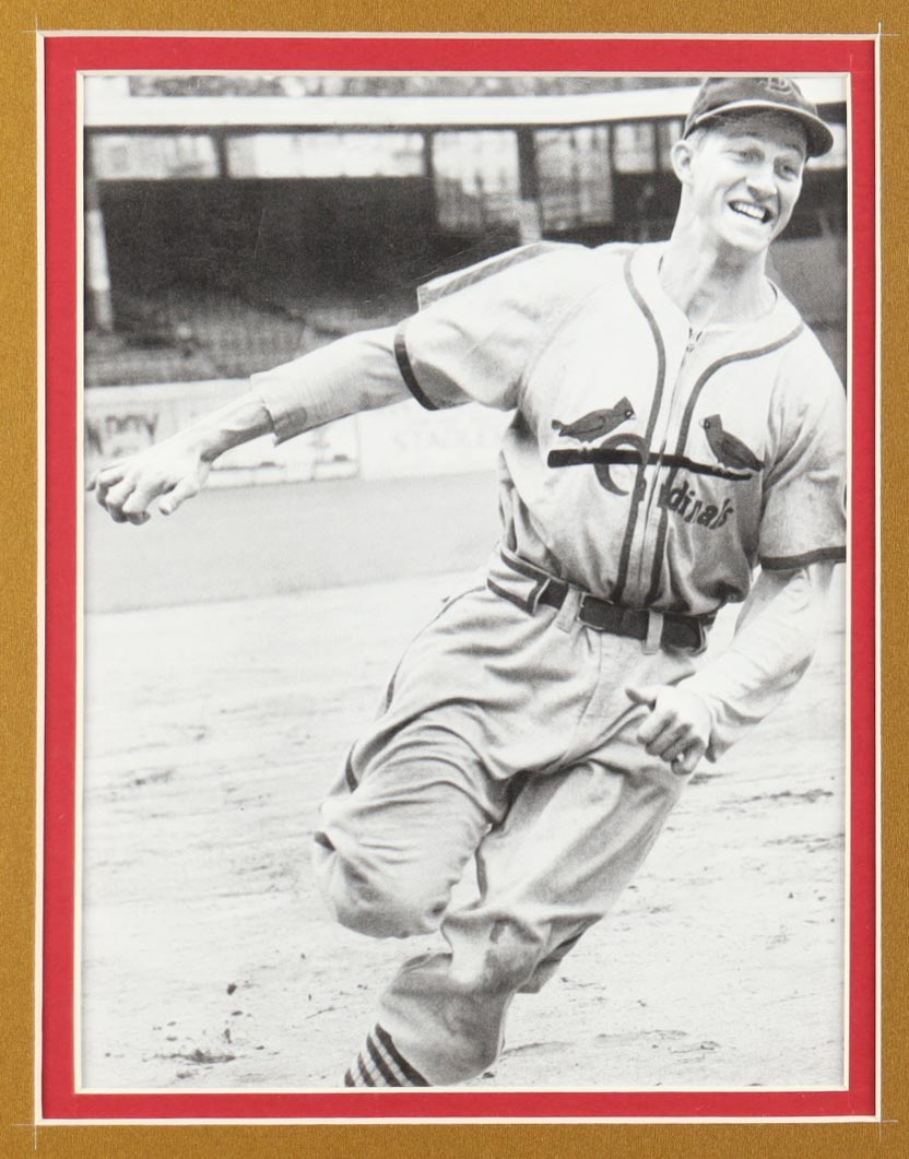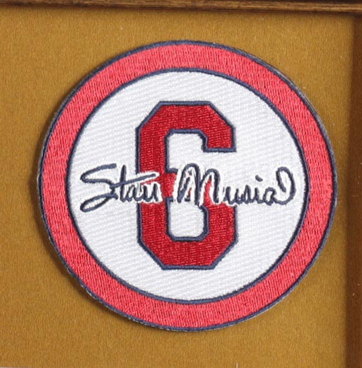 Custom frame display measures approximately 32" x 36" in size and features a jersey and a cut that has been hand-signed by Stan Musial (D. 2013, HOF). The display also includes a jersey and a Stan Musial lapel Pin, (2) 8" x 10" photos and (2) cloth team logo patches.