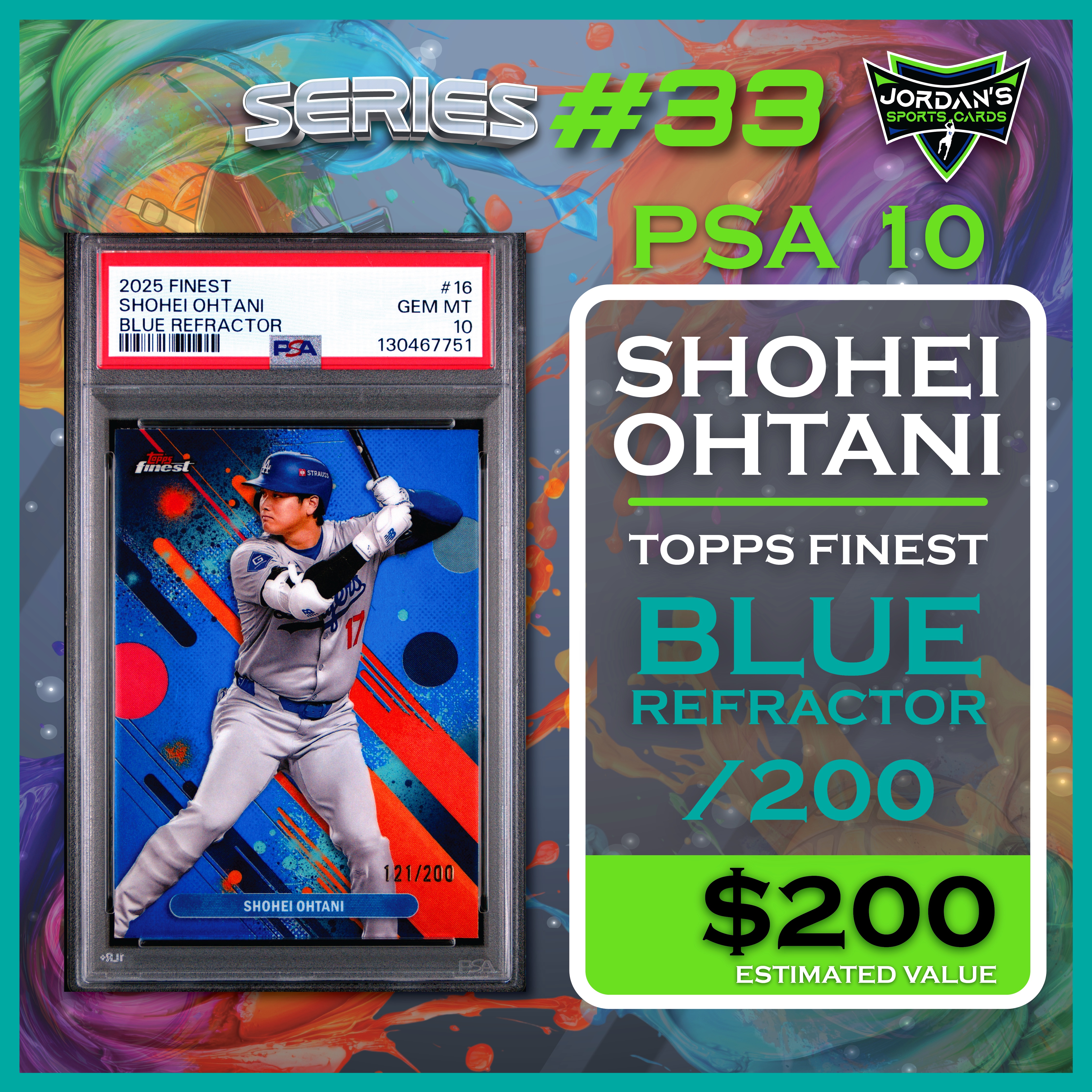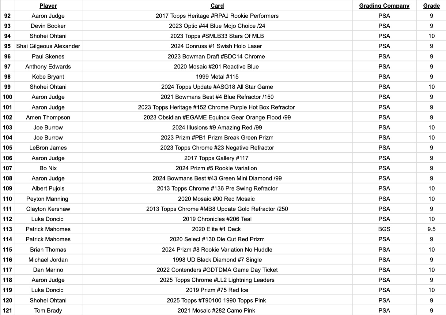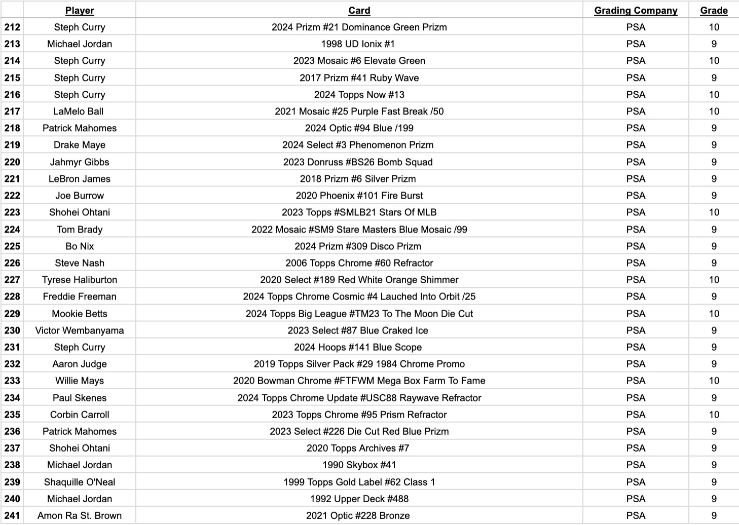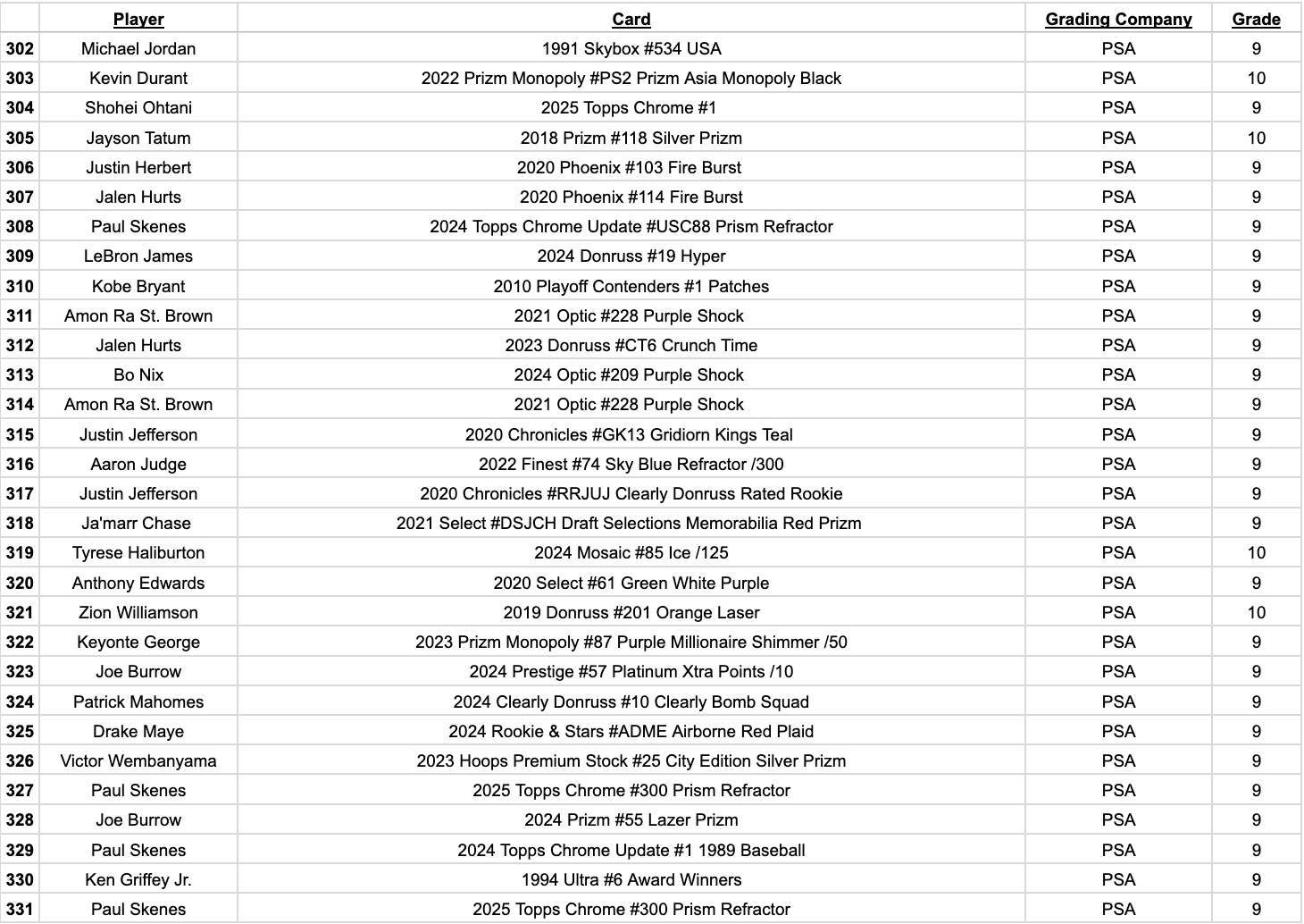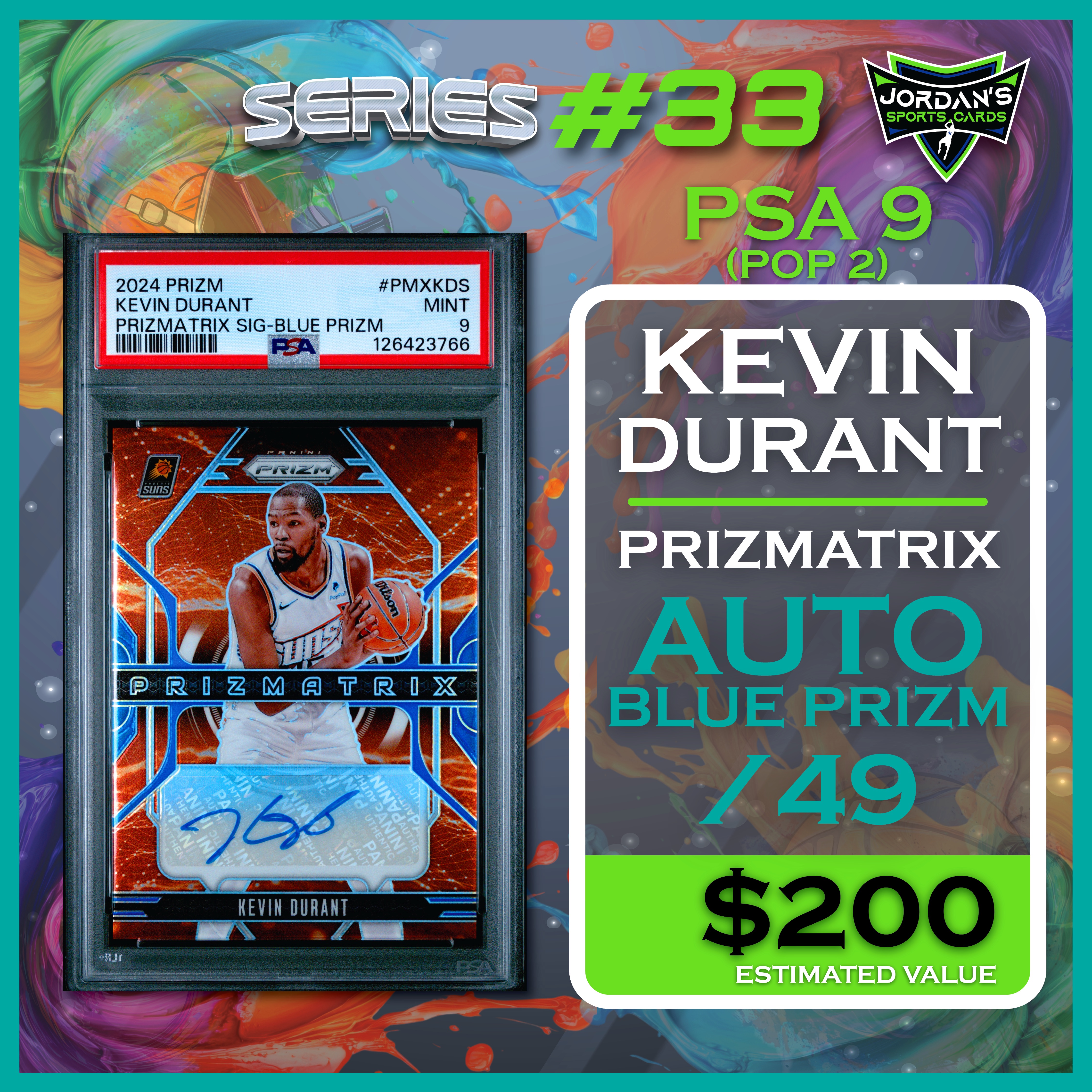 Jordan’s Sports Cards Presents Platinum Quest Series 33: The Sports Card Pack Mystery Pack with (1) PSA or BGS graded baseball, basketball, or football card, including big hits from superstars and hall of famers across all three major sports (600 cards total).