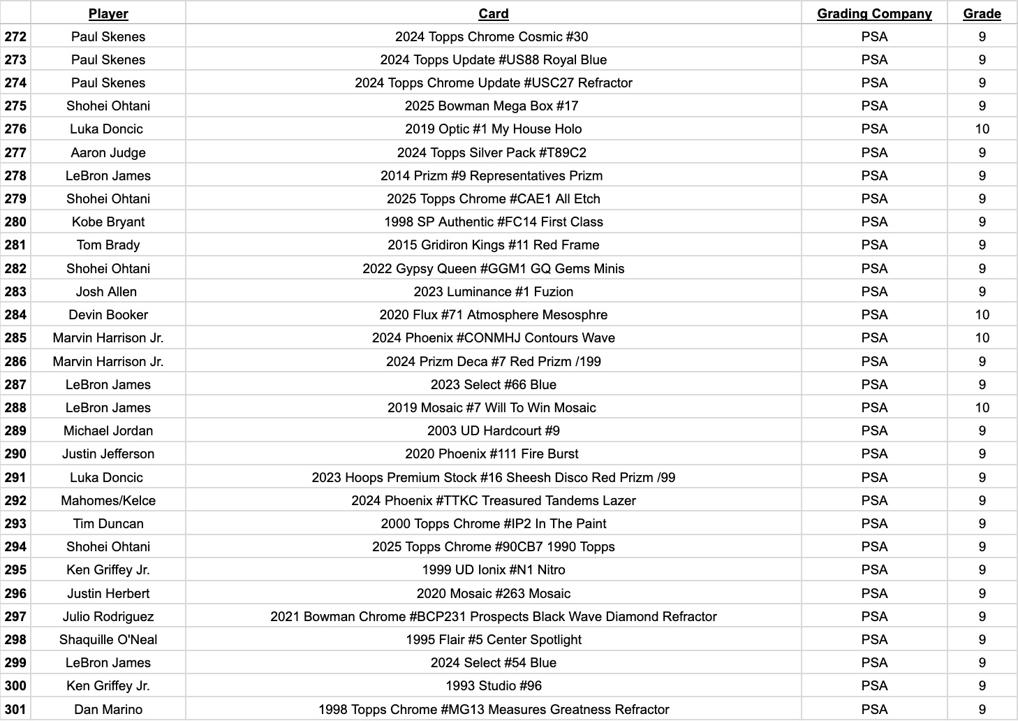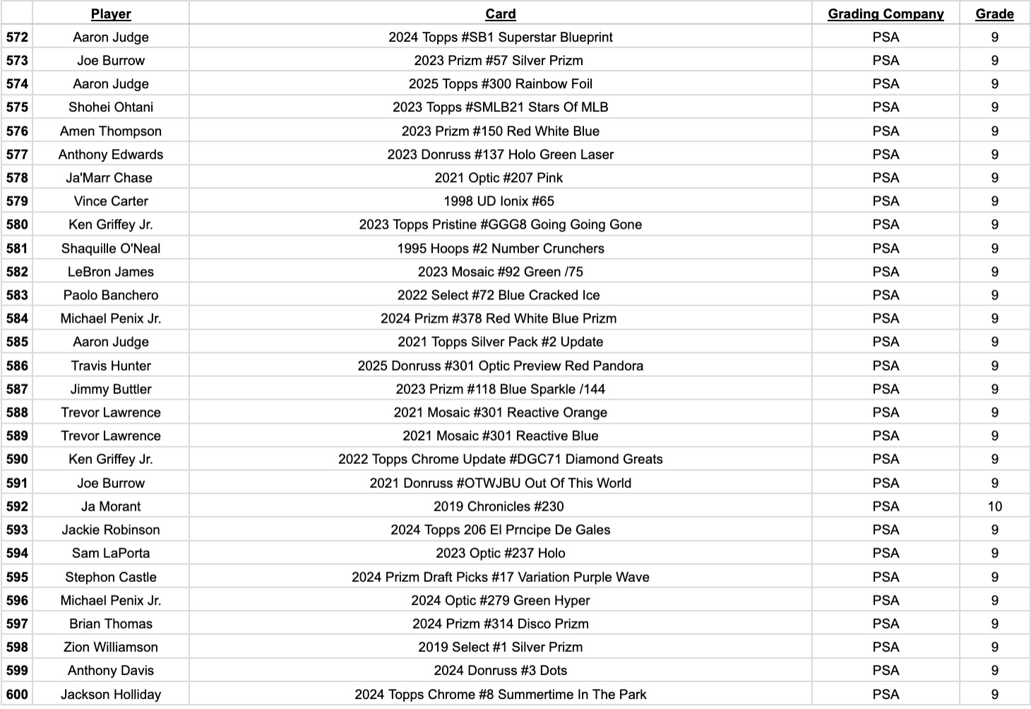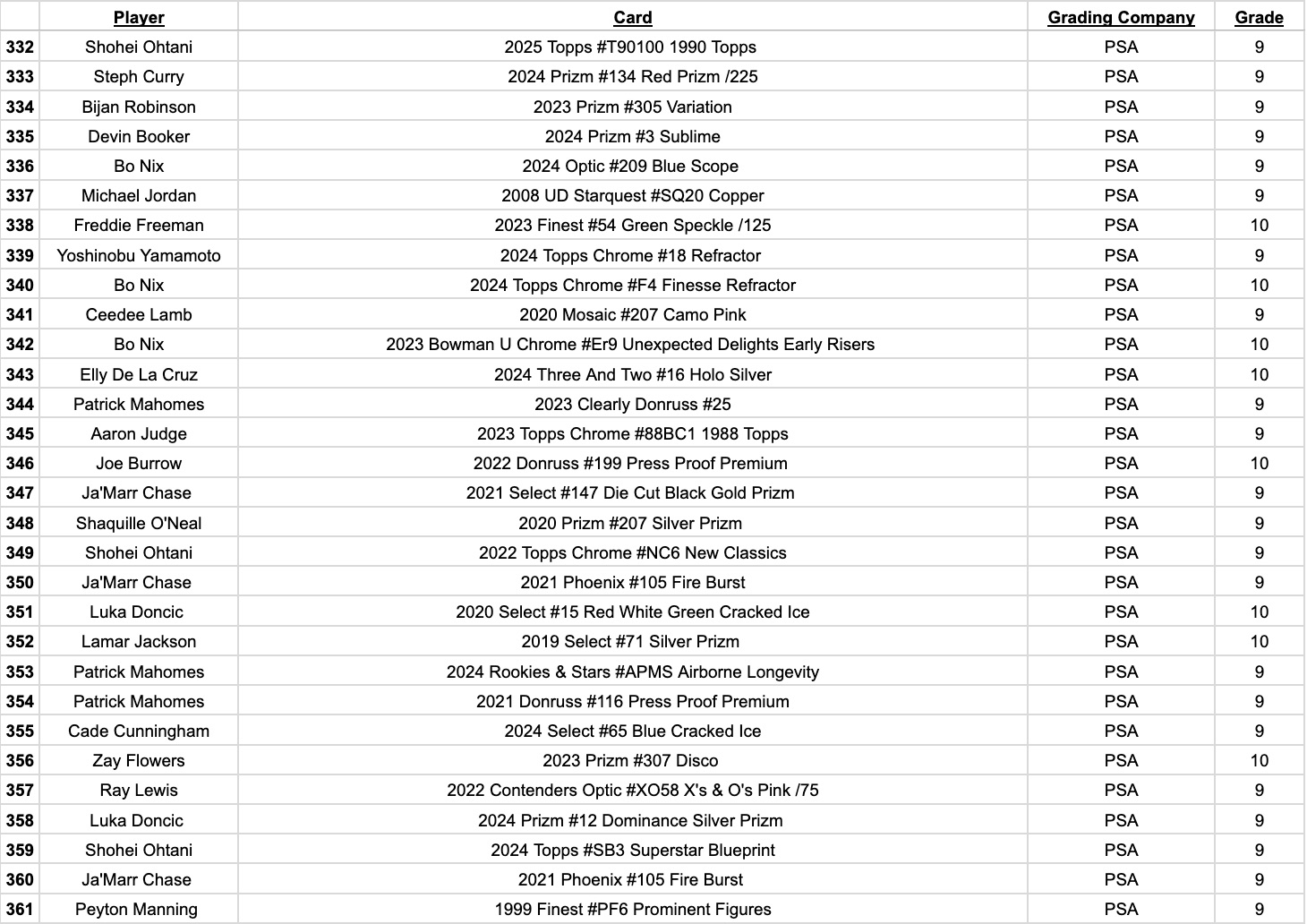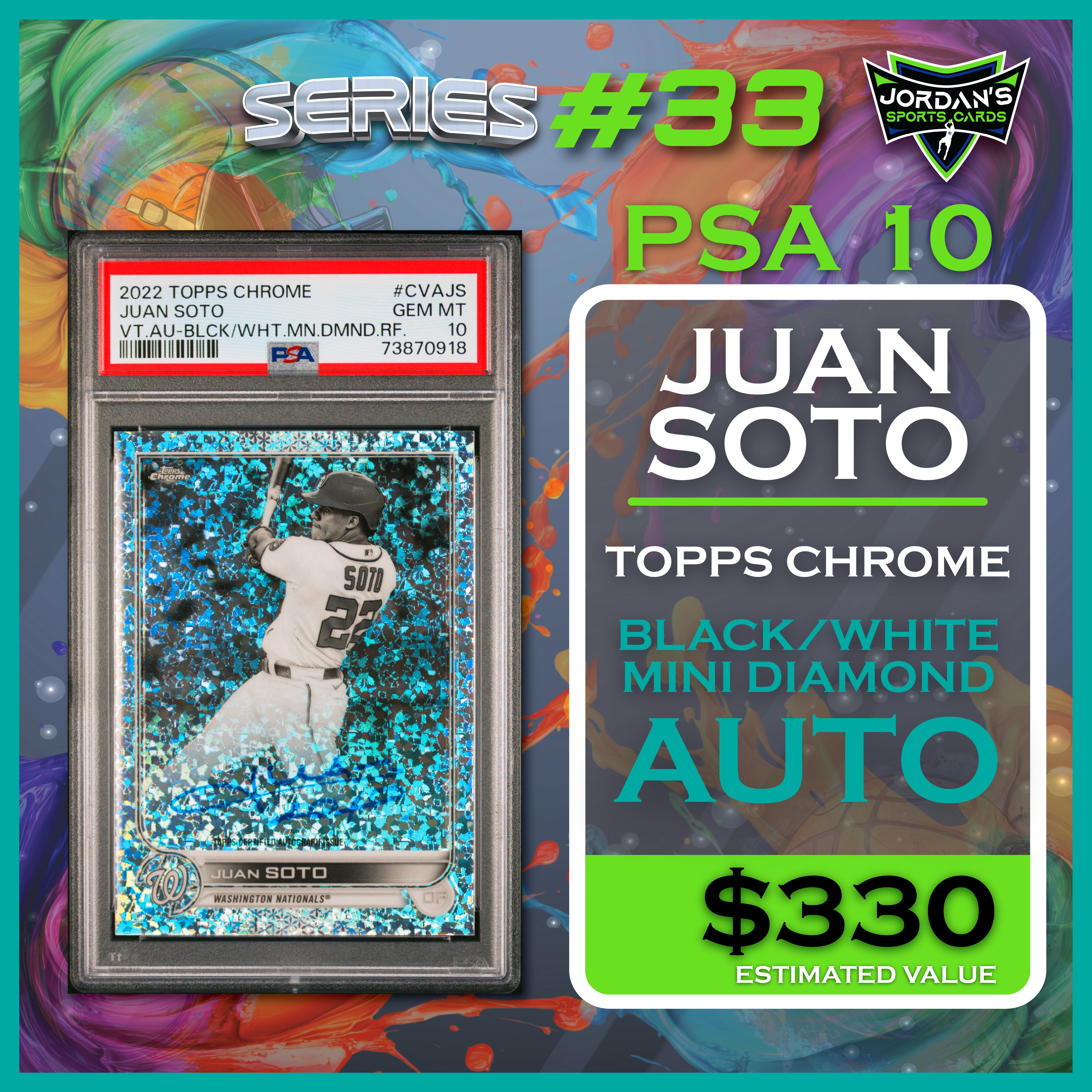Jordan’s Sports Cards Presents Platinum Quest Series 33: The Sports Card Pack Mystery Pack with (1) PSA or BGS graded baseball, basketball, or football card, including big hits from superstars and hall of famers across all three major sports (600 cards total).