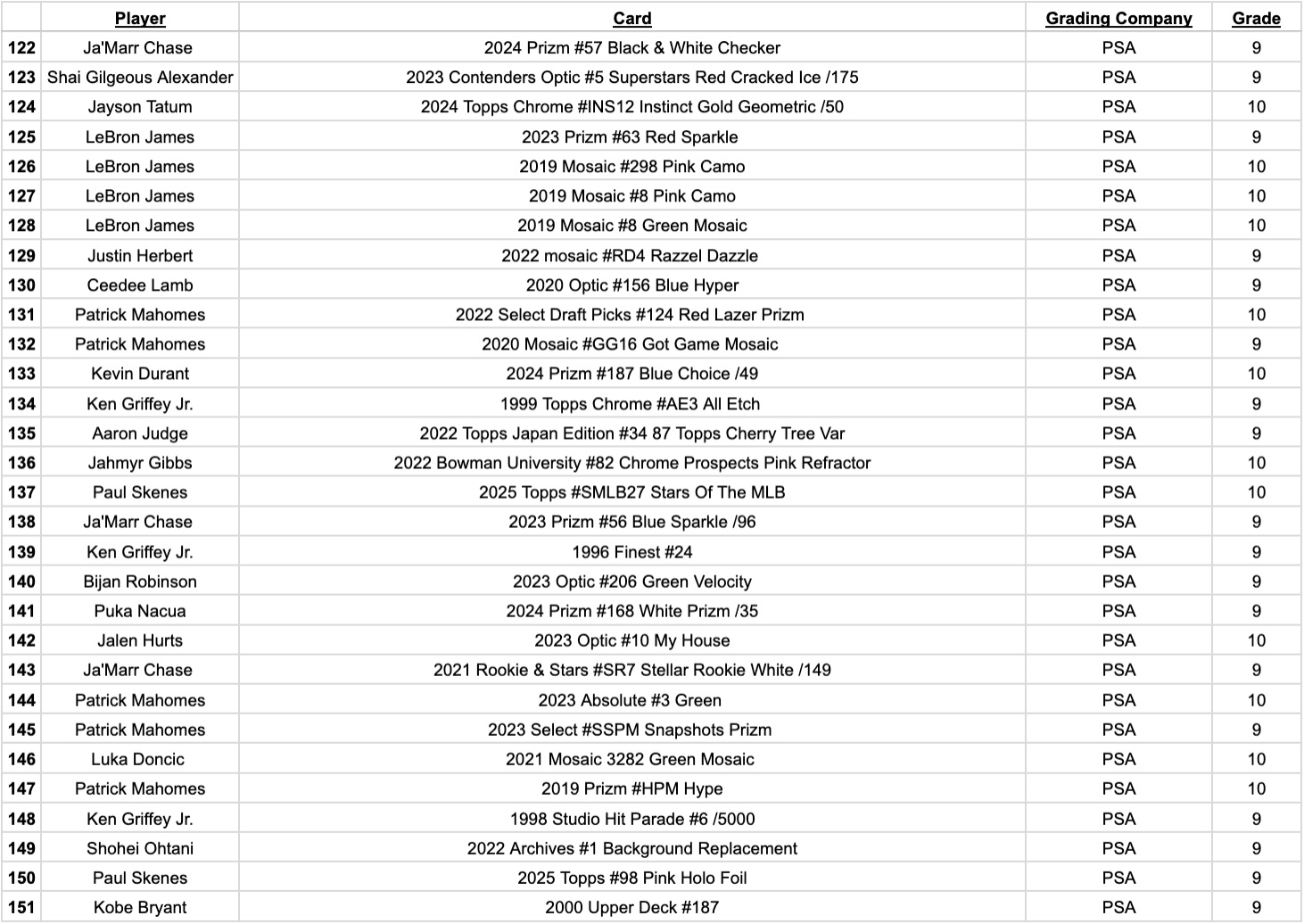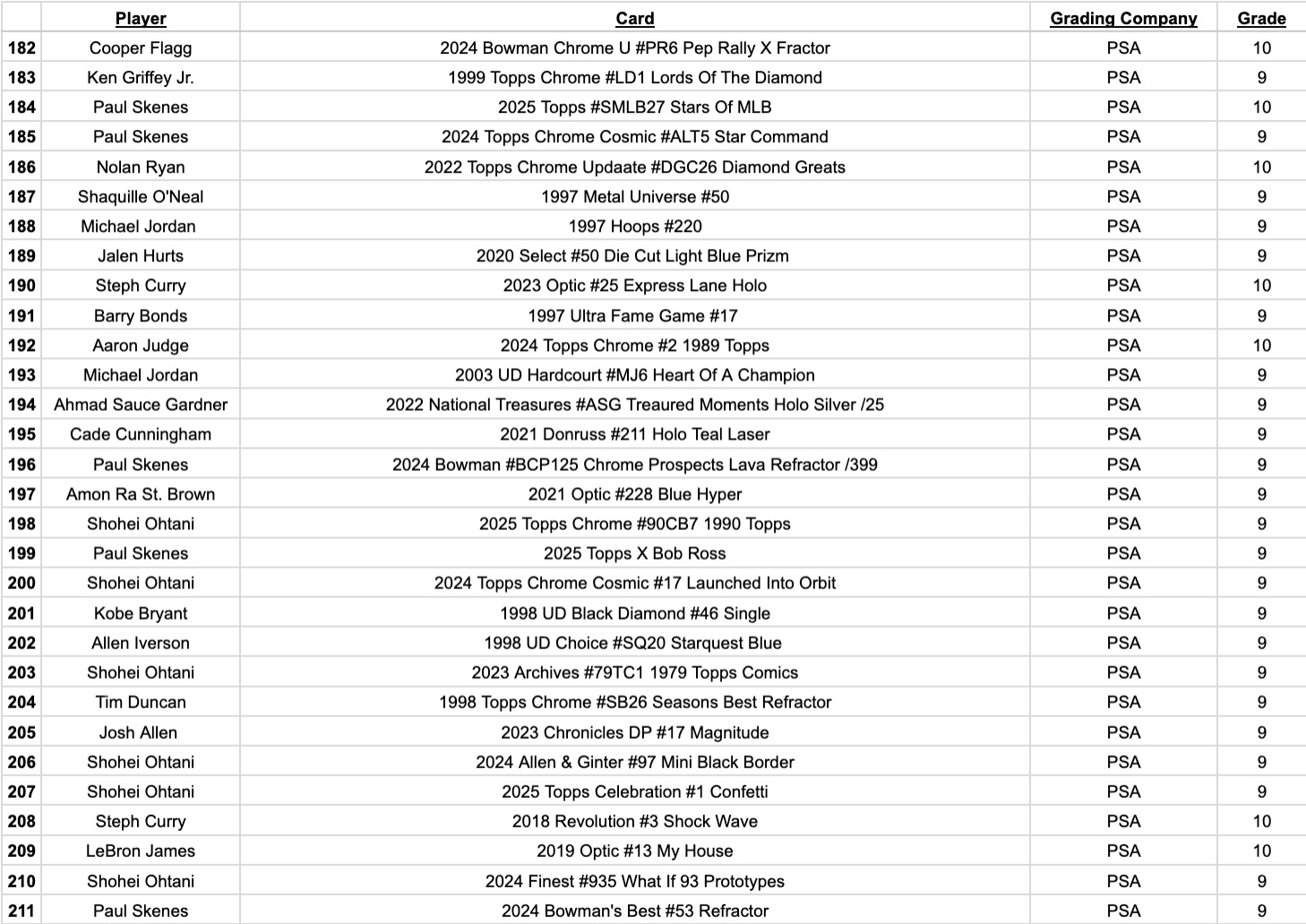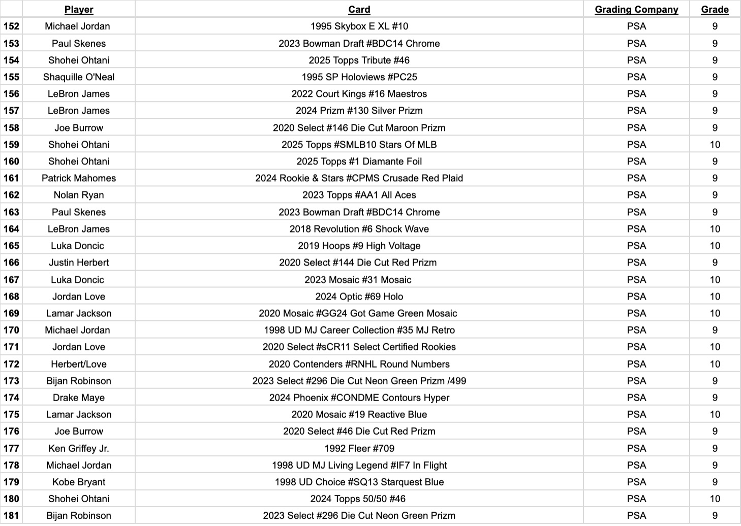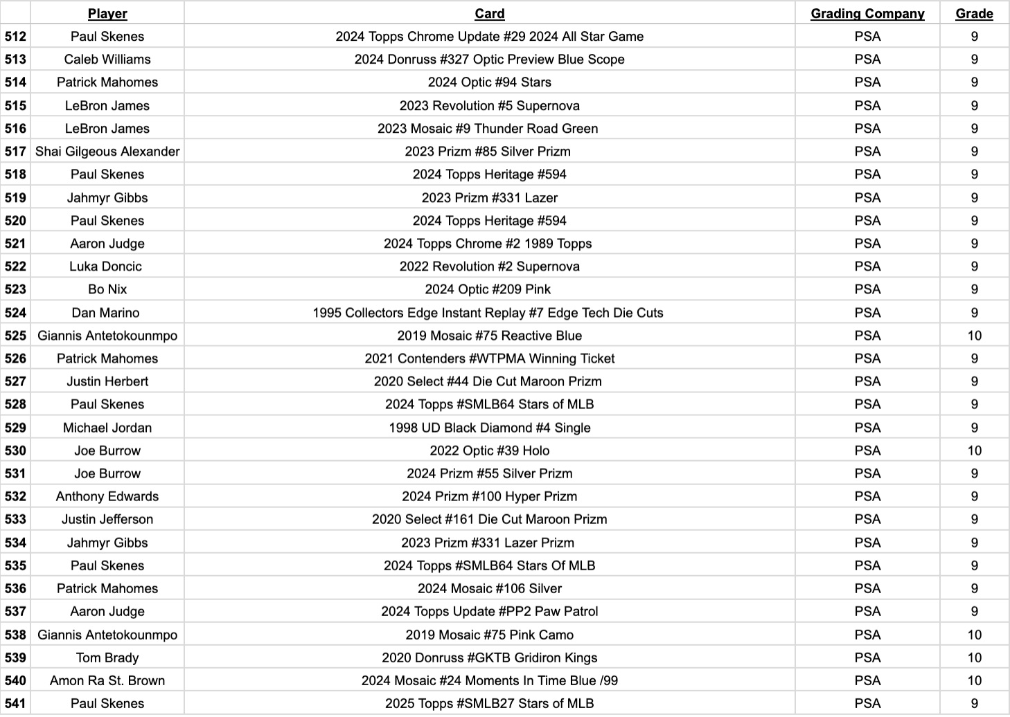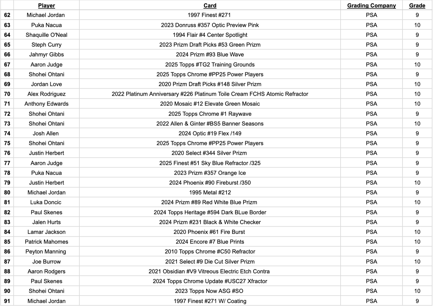 Jordan’s Sports Cards Presents Platinum Quest Series 33: The Sports Card Pack Mystery Pack with (1) PSA or BGS graded baseball, basketball, or football card, including big hits from superstars and hall of famers across all three major sports (600 cards total).