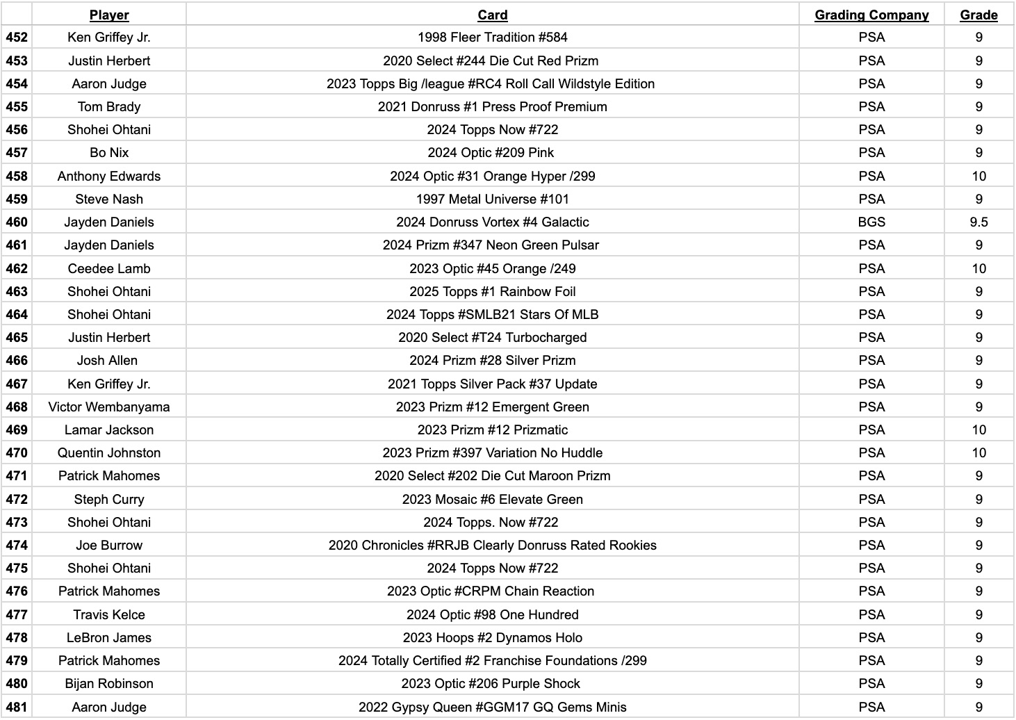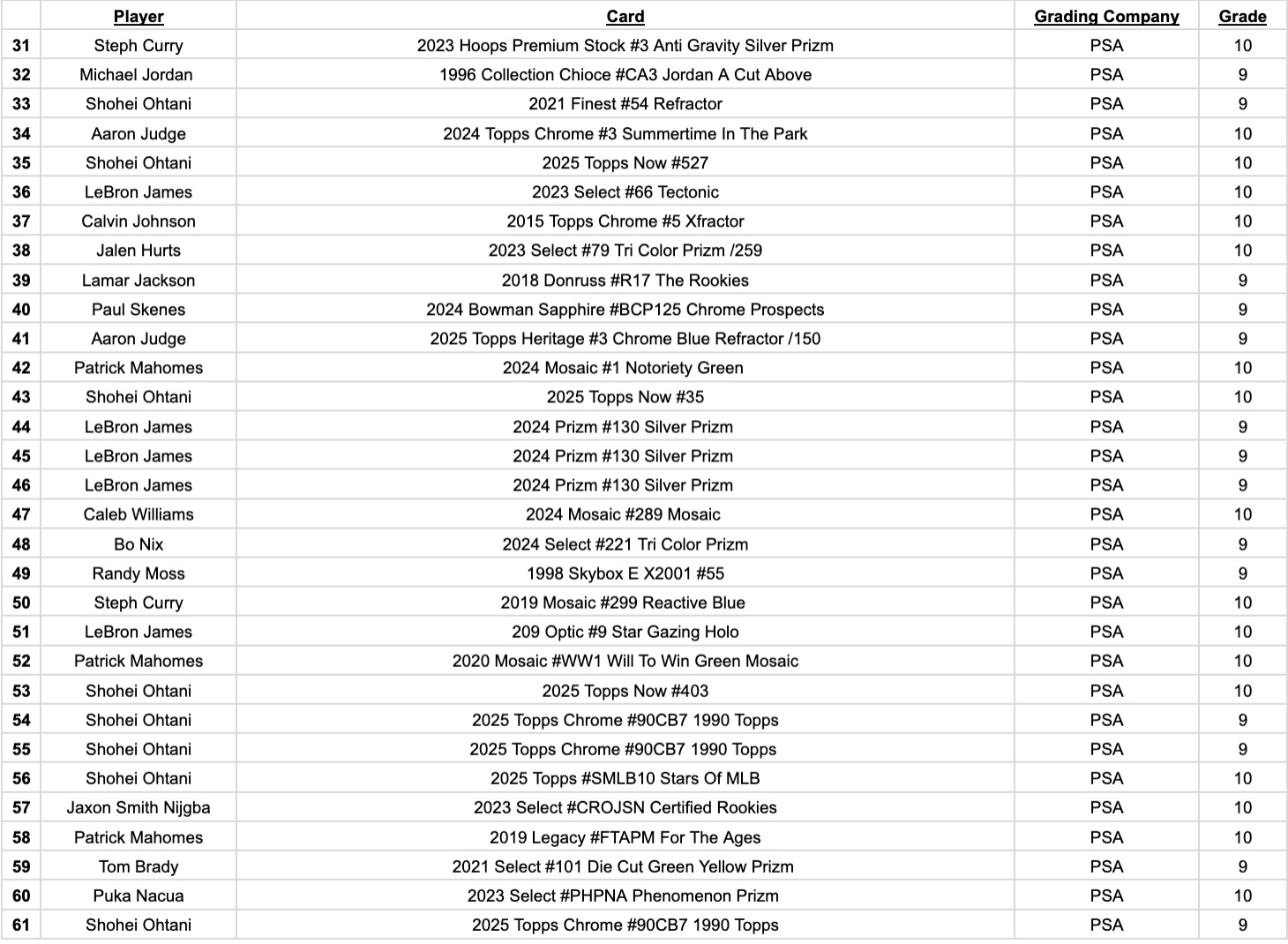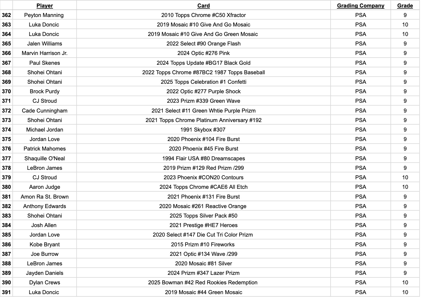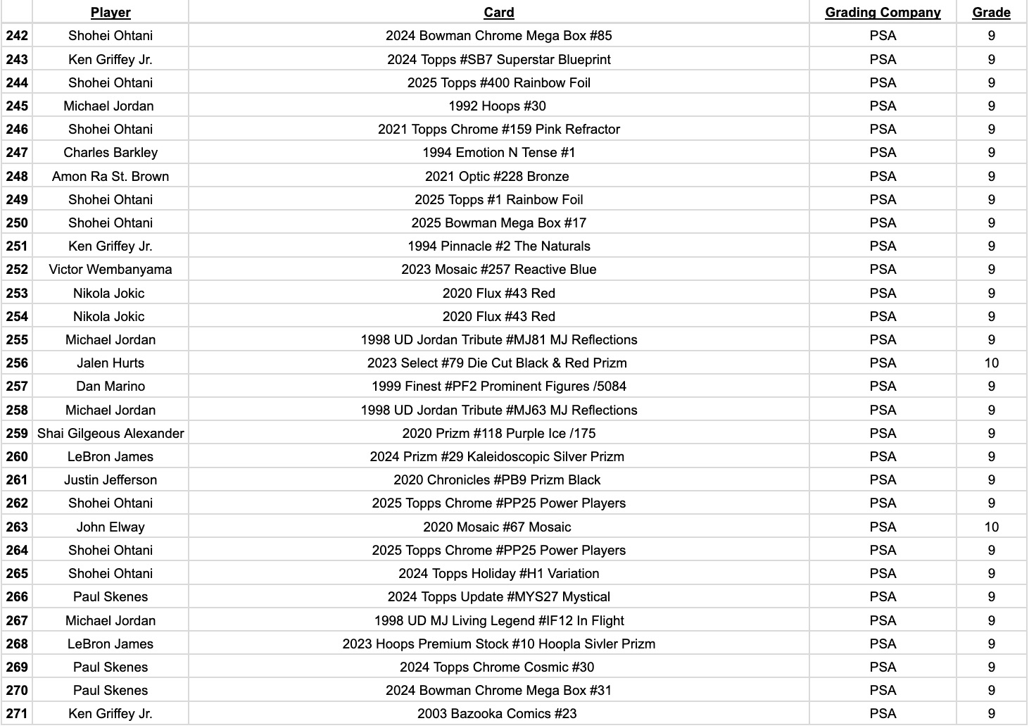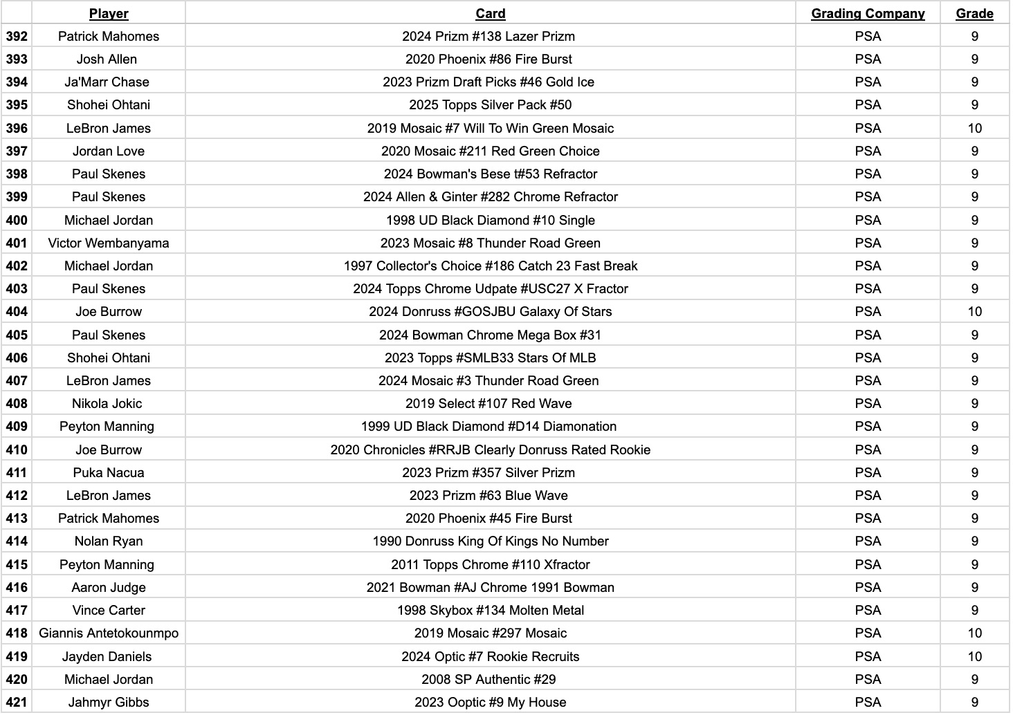 Find cards of Michael Jordan, Shohei Ohtani, Tom Brady, Patrick Mahomes, Kobe Bryant, LeBron James, Mickey Mantle, Josh Allen, Stephen Curry, Aaron Judge, Victor Wembanyama, Paul Skenes, Joe Burrow, Mike Trout, Kevin Durant, Allen Iverson, Luka Doncic, Ken Griffey Jr., Anthony Edwards, Jayson Tatum, Magic Johnson, Larry Bird, Peyton Manning, and more