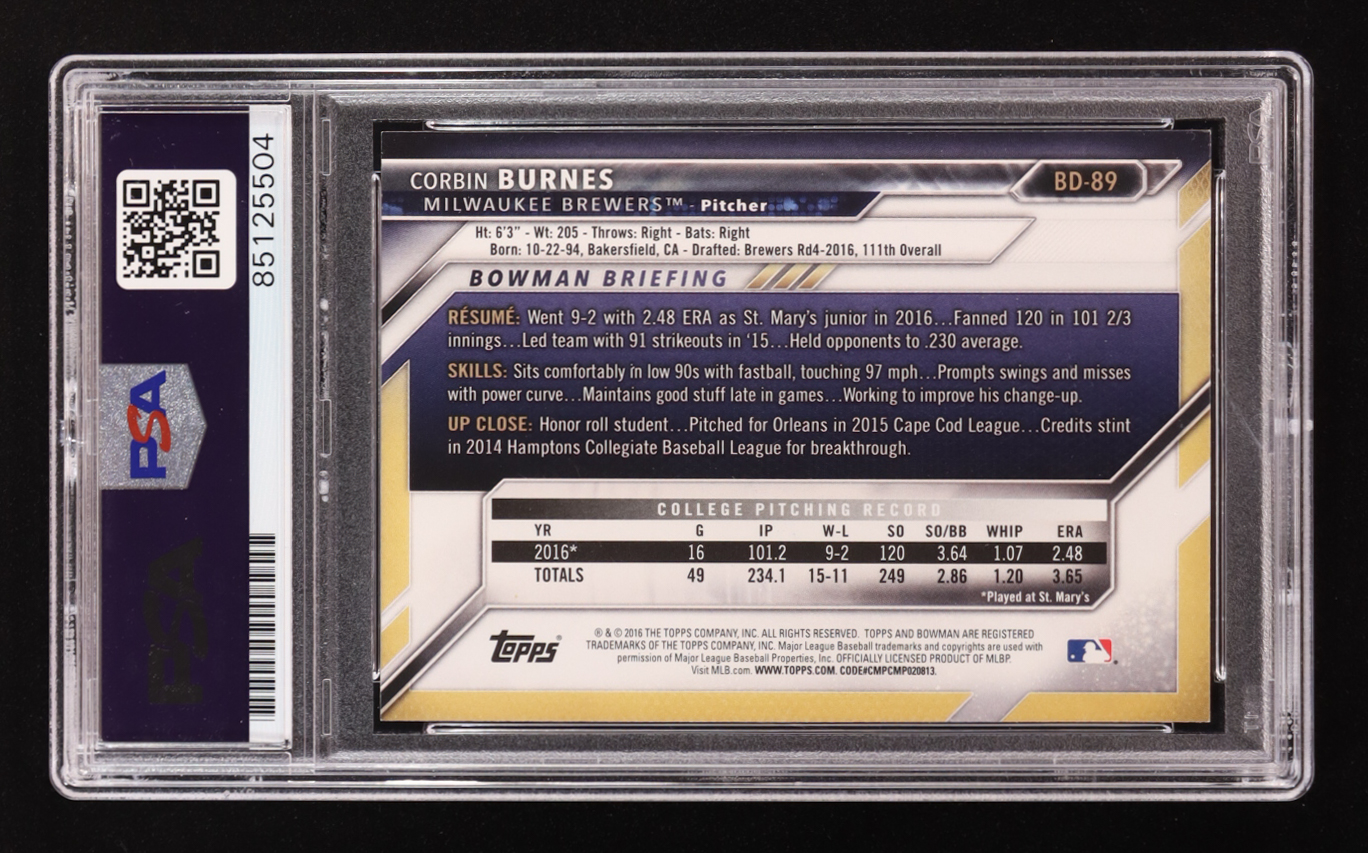 Corbin Burnes Signed 2016 Bowman 1st #BD-89 RC (PSA)