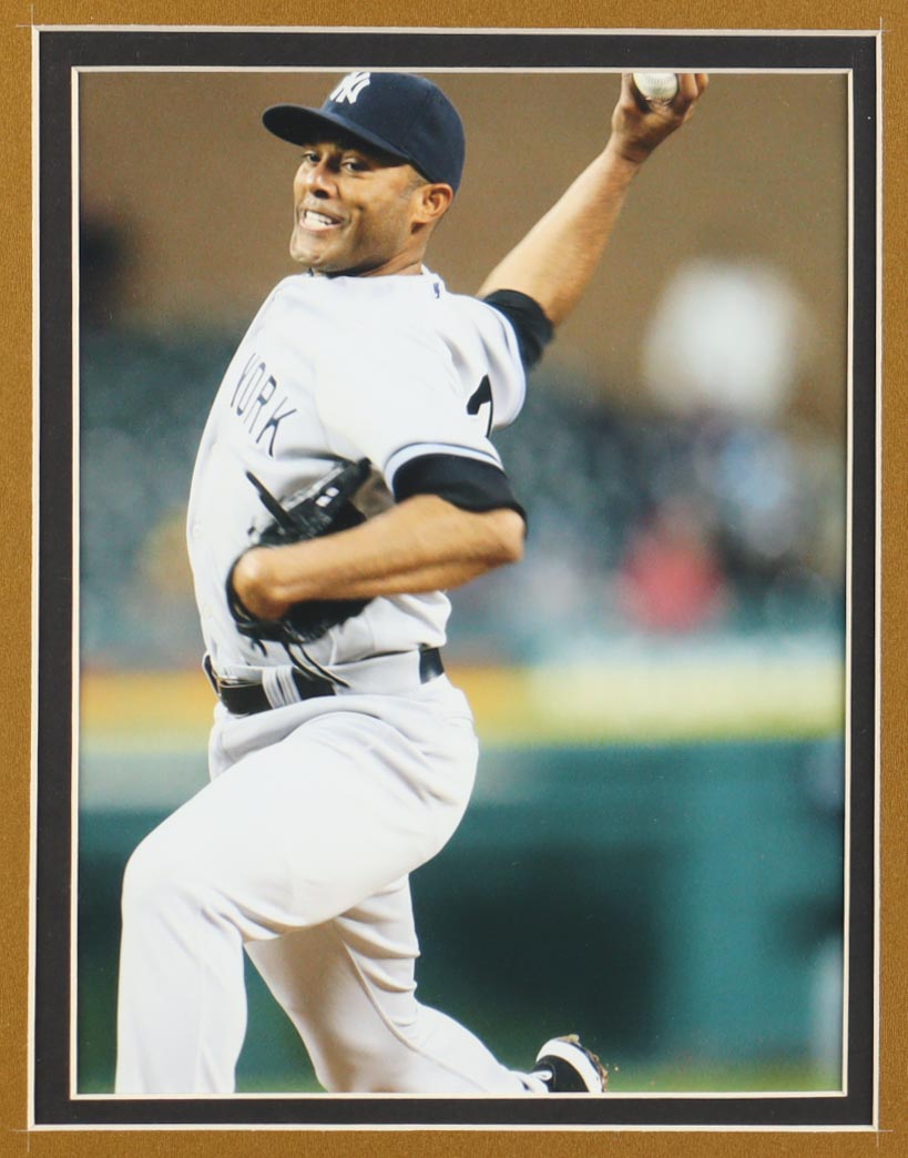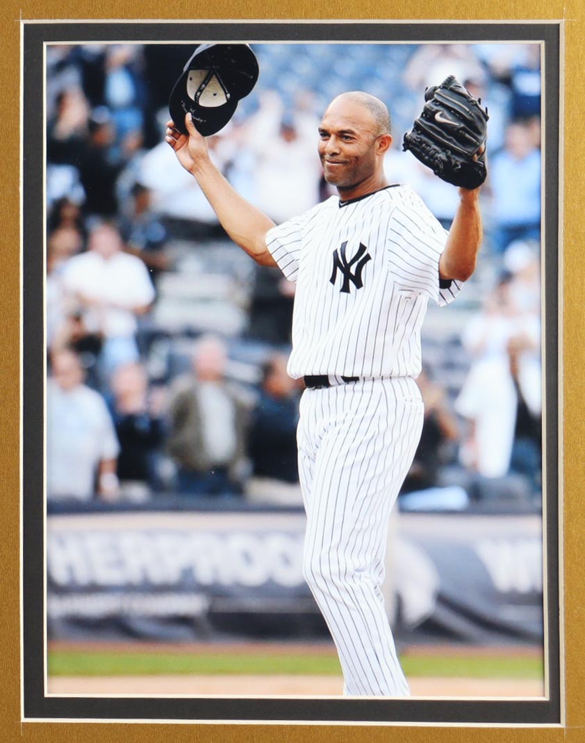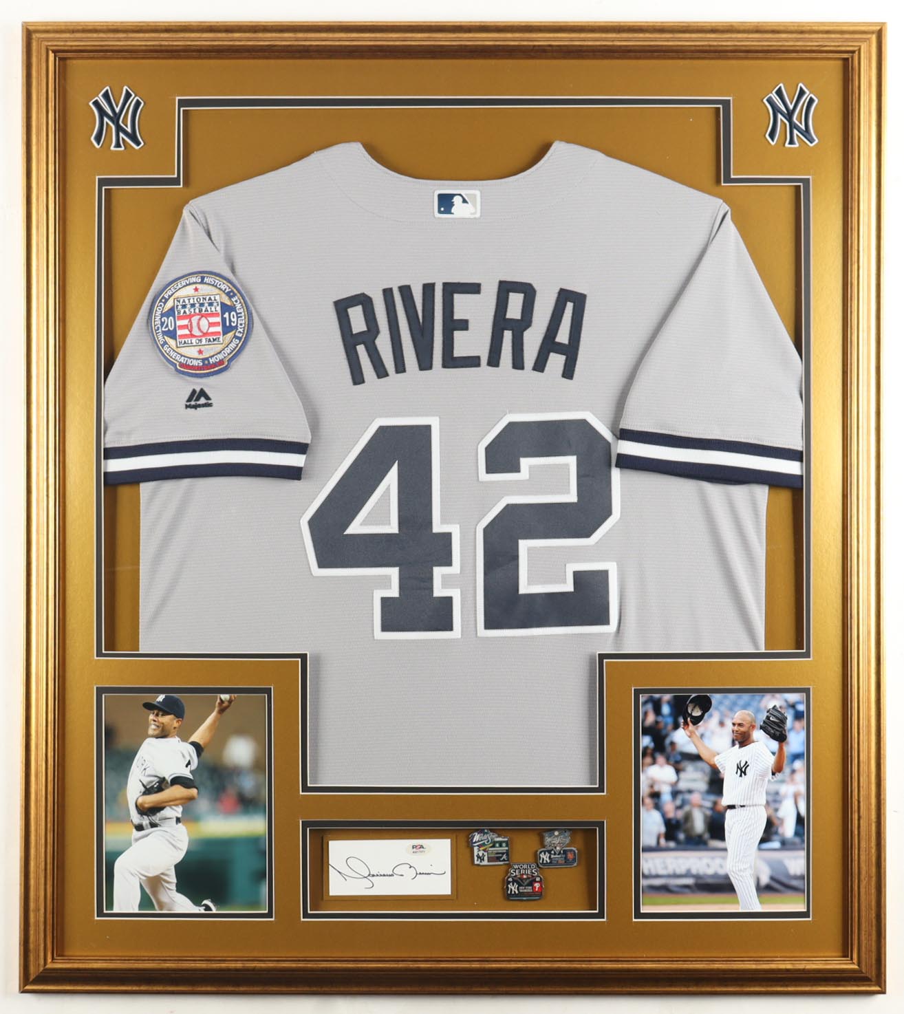 Custom frame display measures approximately 32" x 36" in size and features a jersey and a cut that has been hand-signed by Mariano Rivera (HOF). The display also includes (2) 8" x 10" photos and (2) cloth team logo patches and (3) World Series pins. Please see photos for details regarding the condition of the item.
