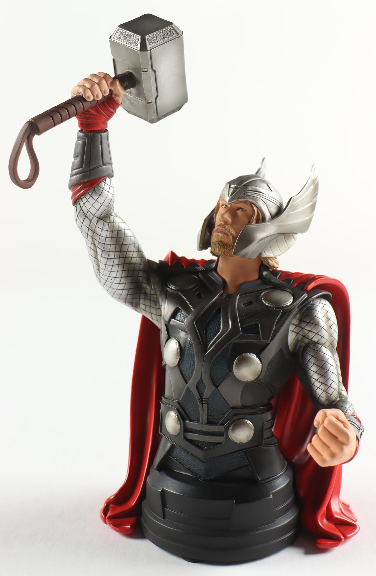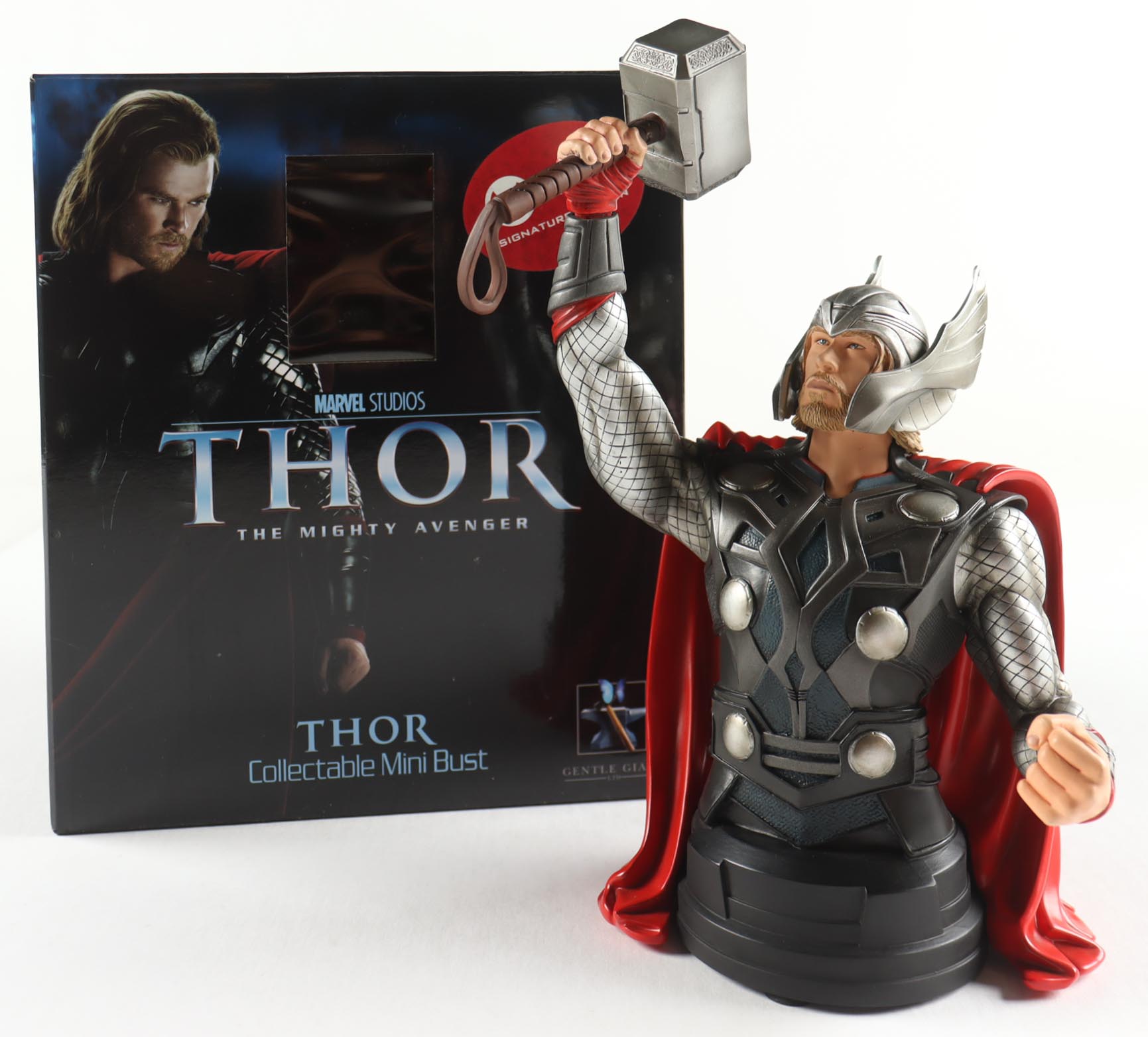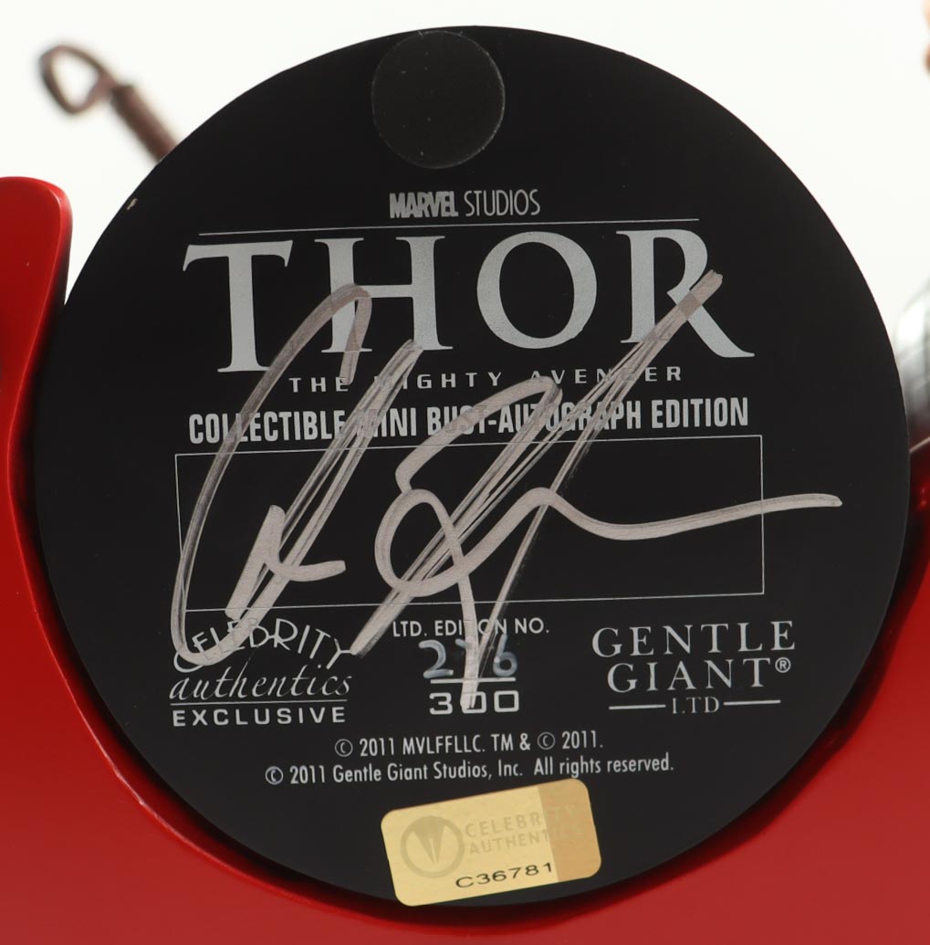 Gentle Giant Celebrity Authentics exclusive Thor mini bust 7.5" tall. Hand-signed on the base by Chris Hemsworth (Thor Odinson). Item is limited edition #276/300. Please note the hammer is glued together as it was broken