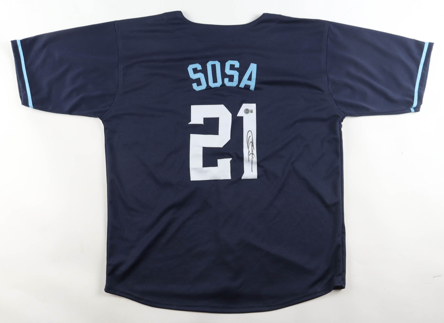 Custom jersey with everything sewn on, size XL. Hand-signed by Sammy Sosa.