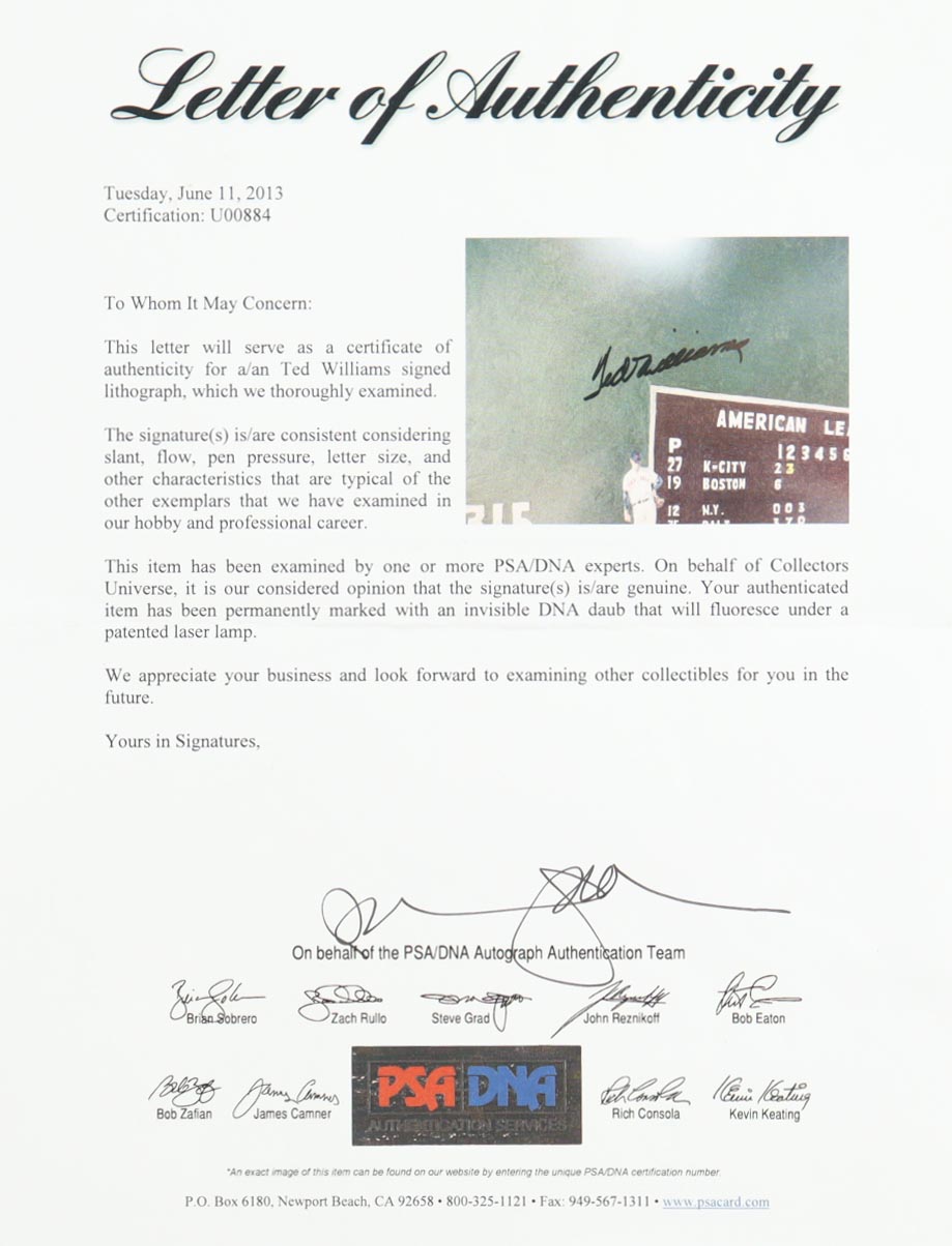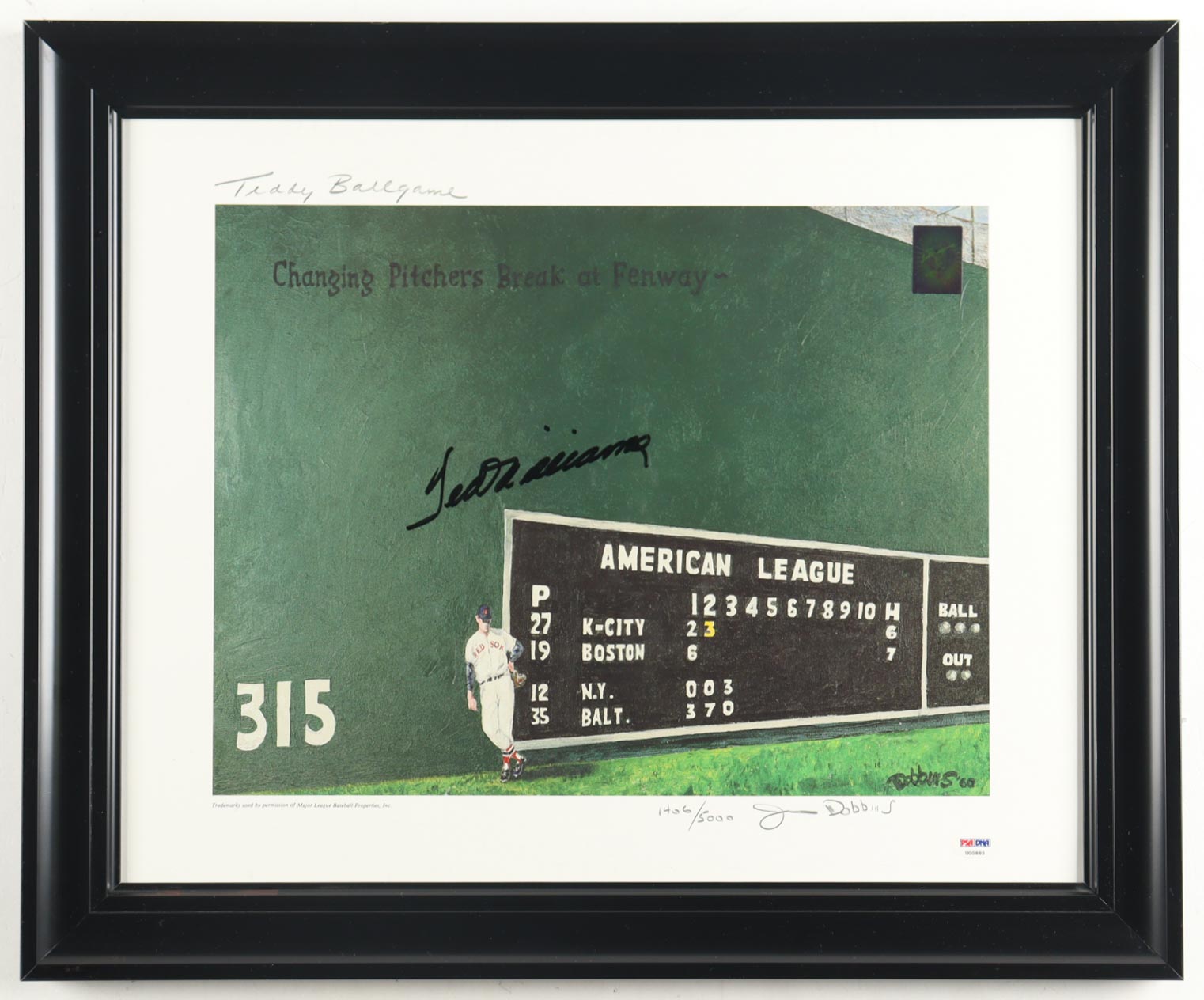 Custom framed display measures approximately 19" x 23" in size and features a lithograph from Jim Dobbins (D. 1994) that has been hand-signed by Ted Williams (D. 2002, Boston Red Sox, HOF). Please see photos for details regarding the item. Note that the item has been labeled Limited Edition # 1,406 / 5,000.