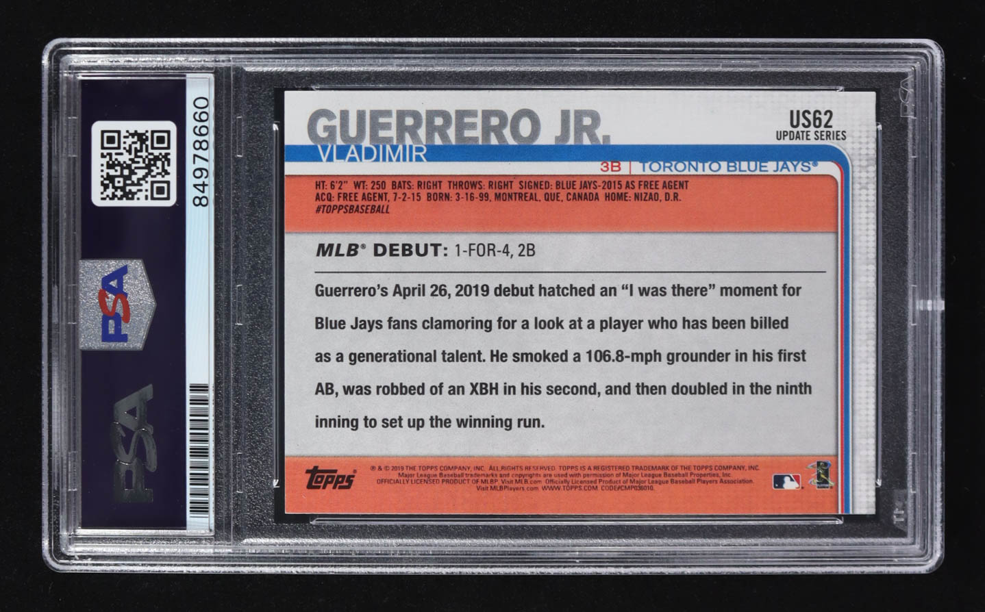 Vladimir Guerrero Jr. Signed 2019 Topps Update Series #US-62 RC (PSA | Autograph Graded PSA 10)