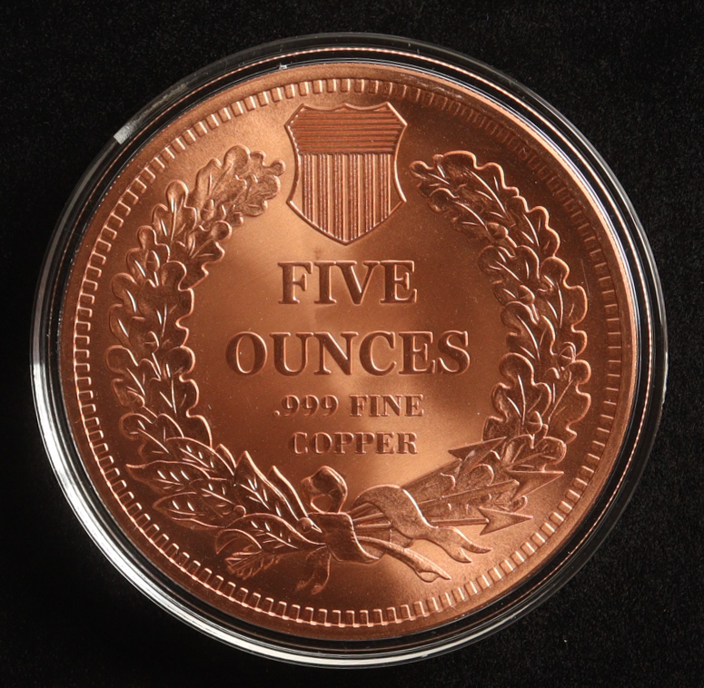 1877 U.S. Indian Head Penny Design 5 Ounce .999 Fine Copper Bullion Coin