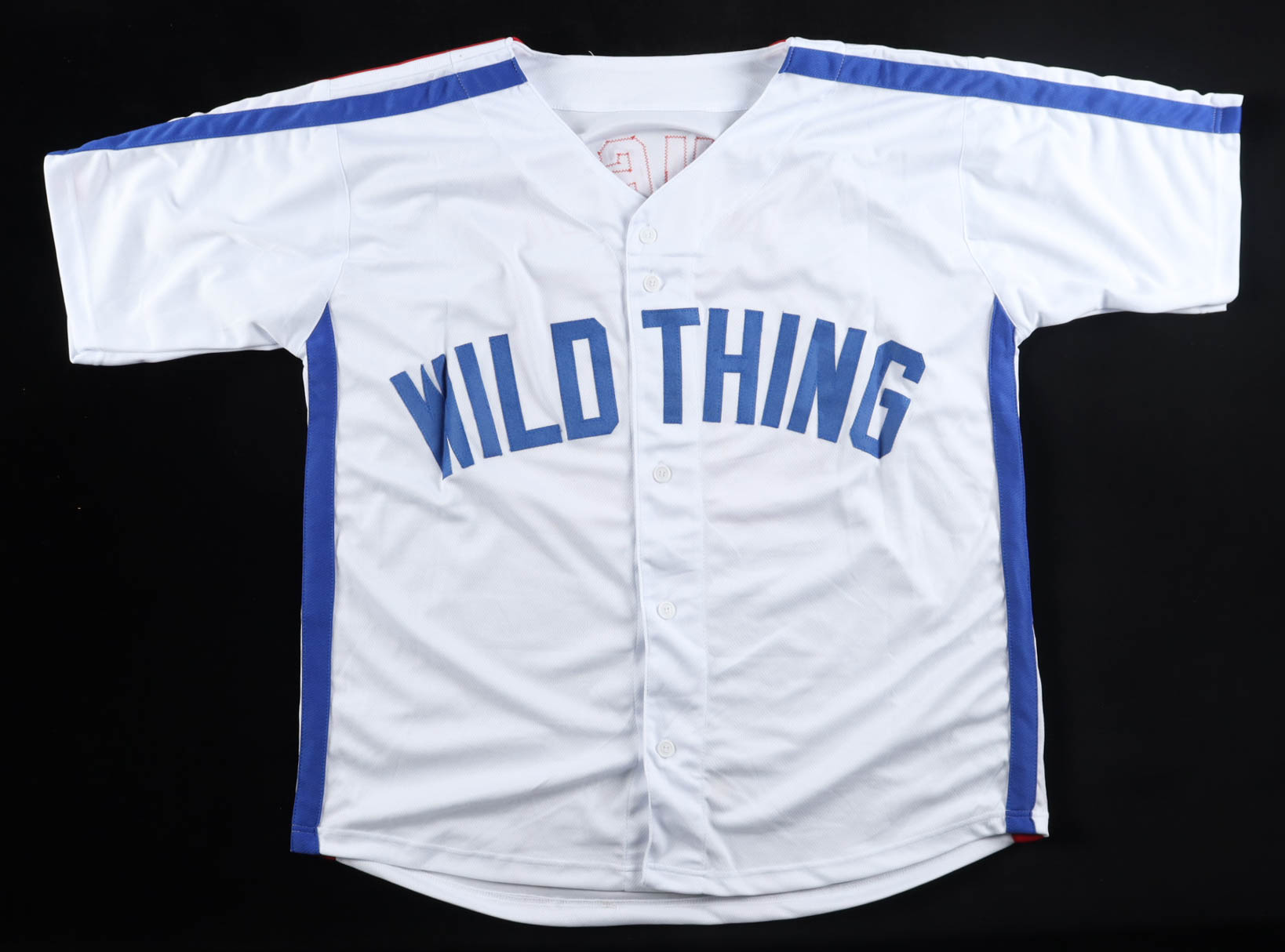 Custom jersey with everything sewn on, size XL. Hand-signed by Charlie Sheen (Ricky "Wild Thing" Vaughn).