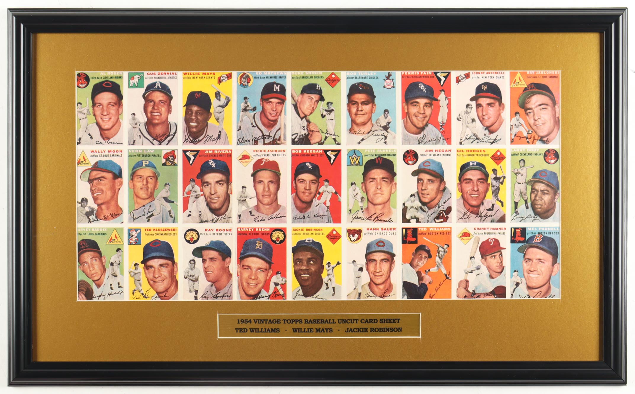 Custom framed display measures approximately 18" x 29" in size and features an uncut sheet of 1954 Topps baseball cards. The display also includes a title plaque. Please note that the item is unsigned.
