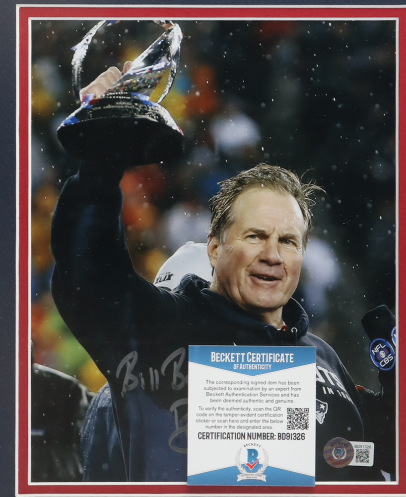 Custom frame measures 13" x 16" in size. 8" x 10" photograph is hand-signed by Bill Belichick (New England Patriots).