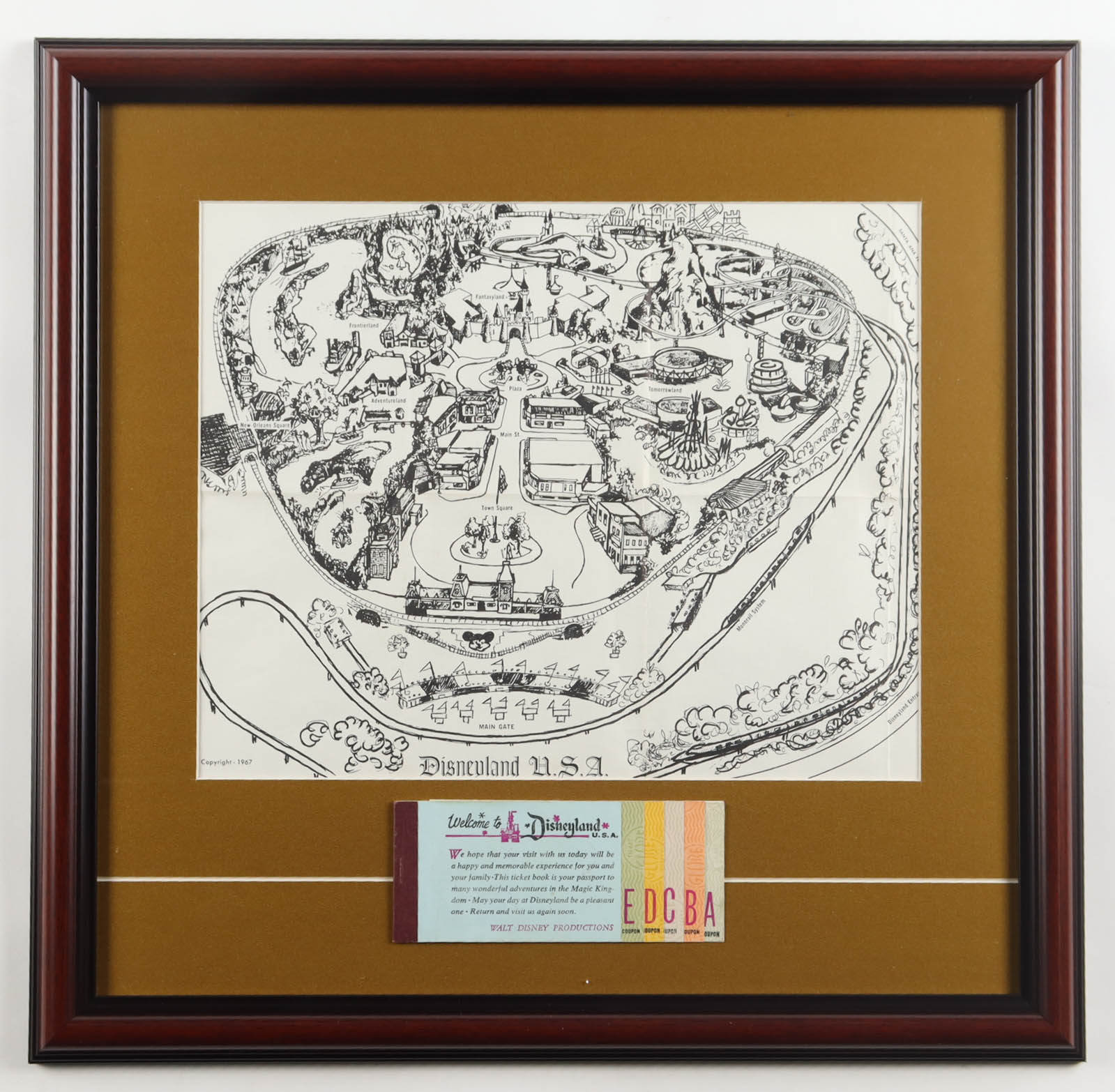 1967 Disneyland USA Custom Framed Vintage Black & White On-Site Park Map Display with A-E Vintage Ticket Book