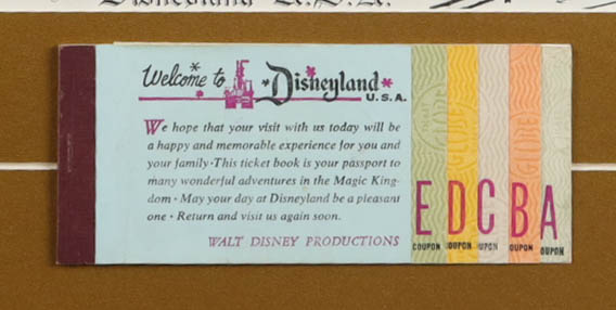 Custom frame measures approximately 19" x 19" in size. The display features an 1967 on-site vintage park map and A-E vintage ticket book. Please note, the display is unsigned.