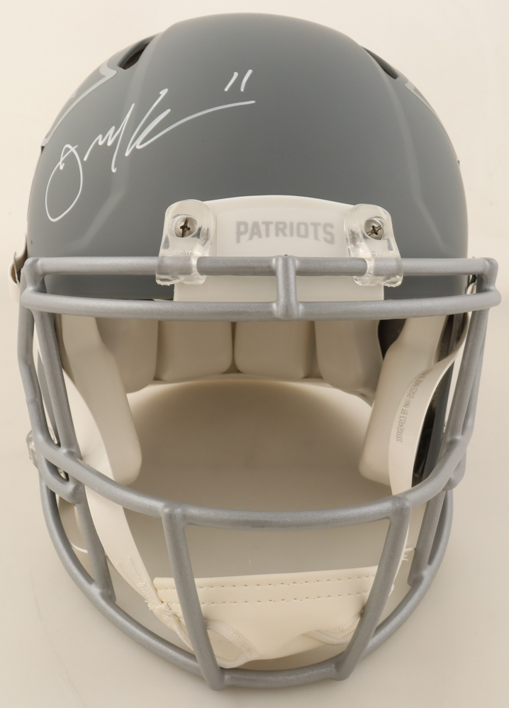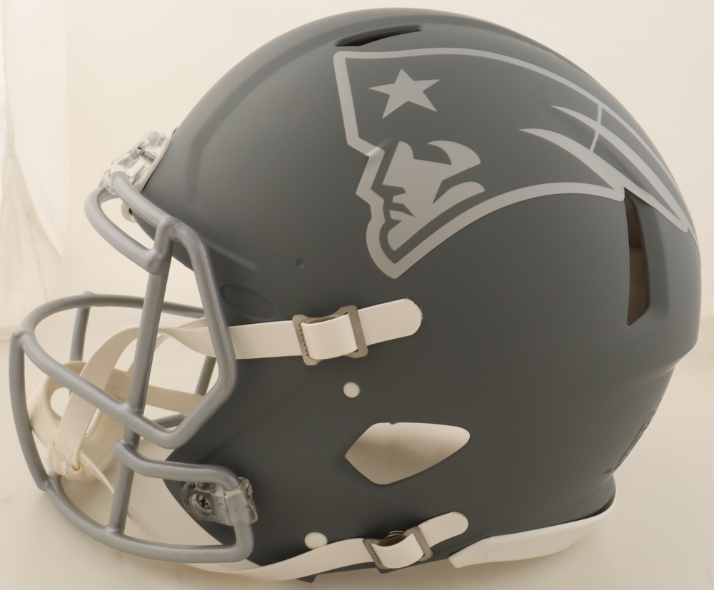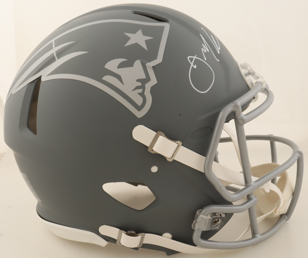Riddell New England Patriots full-size authentic on-field slate alternate speed helmet. Hand-signed by Julian Edelman.