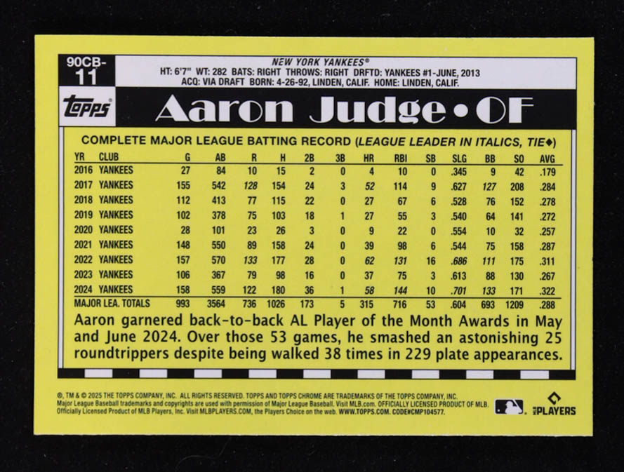 Aaron Judge 2025 Topps Chrome '90 Topps #90CB11